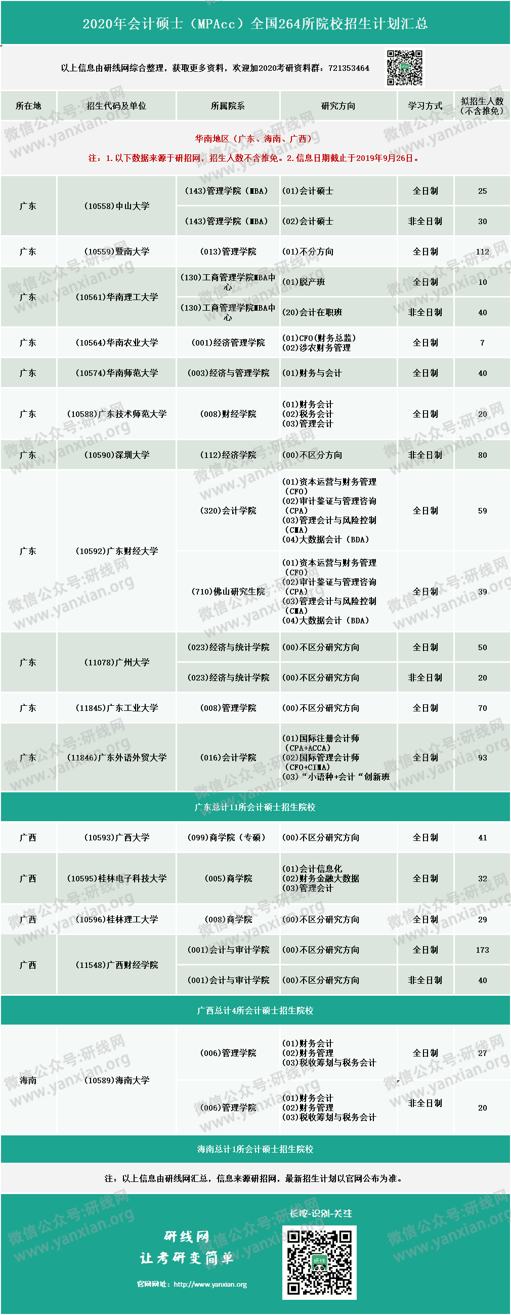 請(qǐng)考生認(rèn)真查看小編匯總“2020年會(huì)計(jì)碩士(MPAcc)全國(guó)招生信息連載之華北、華南地區(qū)”的全部?jī)?nèi)容!結(jié)合自身情況,客觀(guān)選擇報(bào)考院校。