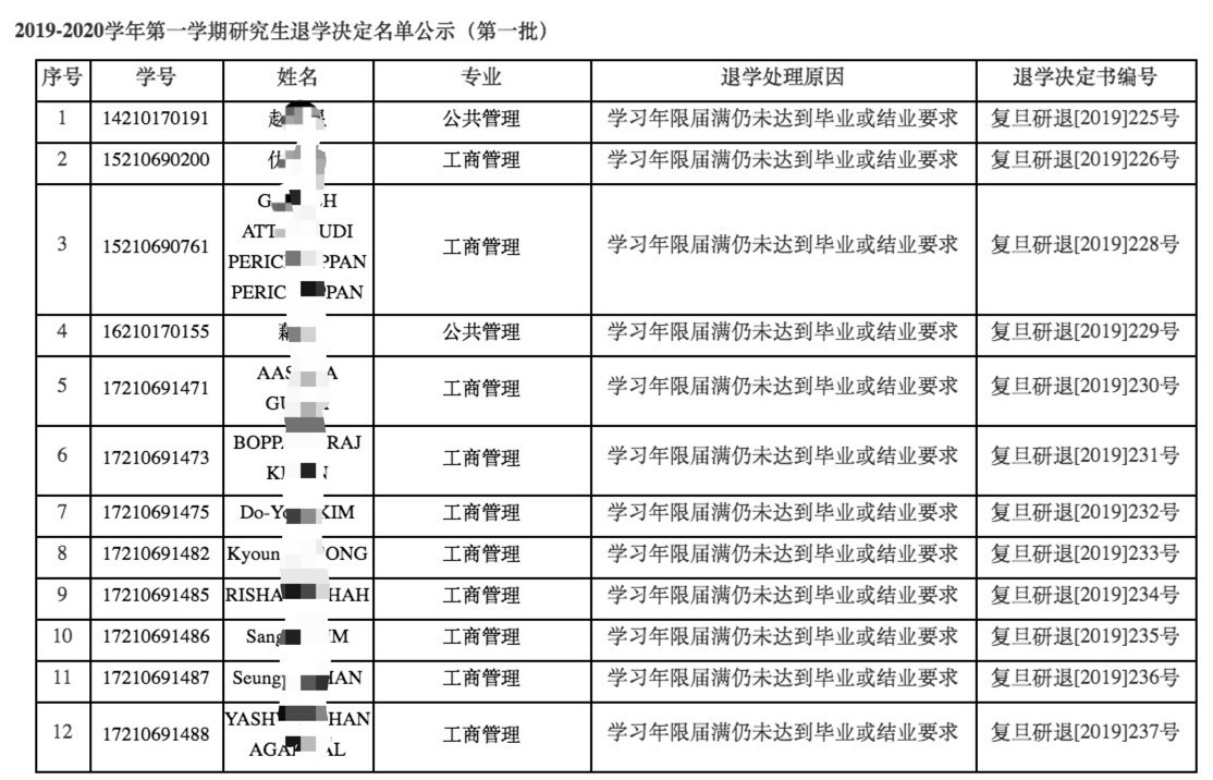 復旦大學2018-2019學年第二學期研究生學籍管理工作中發(fā)現部分研究生存在學習年限屆滿未畢業(yè)或結業(yè)的情況。根據《復旦大學學籍管理規(guī)定》第四十一條、《復旦大學研究生學籍管理實施細則》第三十八條規(guī)定,2019年10月10日經校長辦公會議審議,決定對上述情況研究生予以退學處理(校批字[2019]251號)。