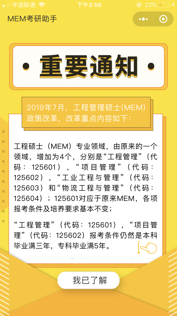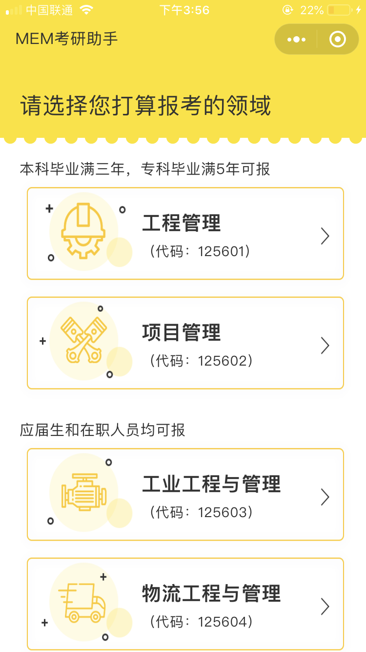MEM越發(fā)受到考研er們的歡迎,特別是今年原工程碩士專業(yè)學(xué)位類別下項目管理、工業(yè)工程、物流工程三個領(lǐng)域調(diào)整到工程管理專業(yè)學(xué)位類別(代碼1256),想報考的同學(xué)有了更多的選擇,MEM考研助手小程序,與成功更近一步——