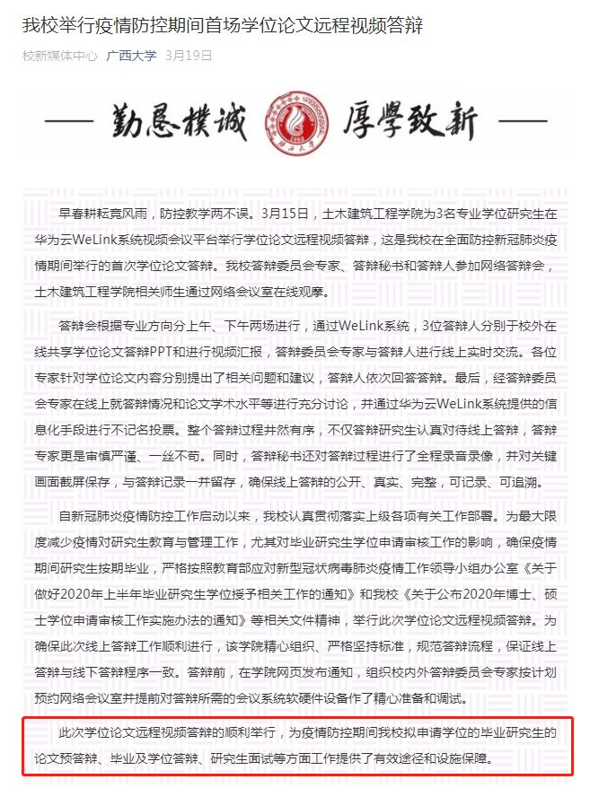 廣西大學(xué)的學(xué)位論文遠程視頻答辯的順利舉行,為疫情防控期間我校擬申請學(xué)位的畢業(yè)研究生的論文預(yù)答辯、畢業(yè)及學(xué)位答辯、研究生面試等方面工作提供了有效途徑和設(shè)施保障。