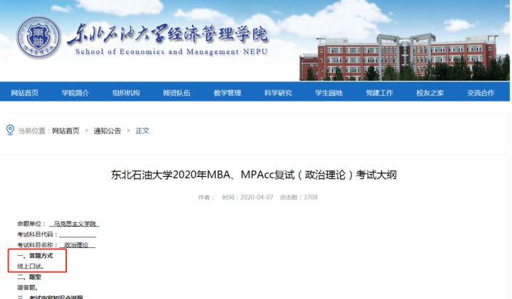 近日,東北石油大學(xué)經(jīng)濟管理學(xué)院官網(wǎng)發(fā)布了2020年MBA、MPACC復(fù)試(政治理論)
