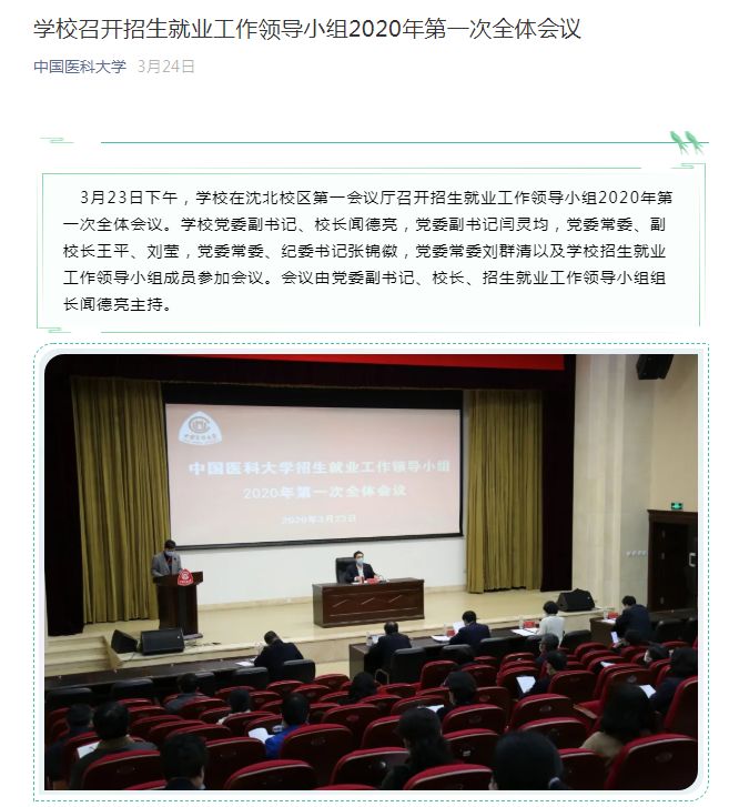 中國醫(yī)科大學(xué)召開招生就業(yè)工作領(lǐng)導(dǎo)小組2020年第一次全體會議,會上強調(diào)進一步完善細化網(wǎng)絡(luò)