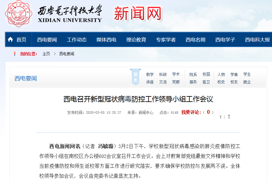 西電召開新型冠狀病毒防控工作領(lǐng)導(dǎo)小組工作會議,要做好研究生招生工作,統(tǒng)籌考慮復(fù)試時間和復(fù)試形式,科學(xué)細致制定網(wǎng)絡(luò)面試等新增環(huán)節(jié)的工作方案。