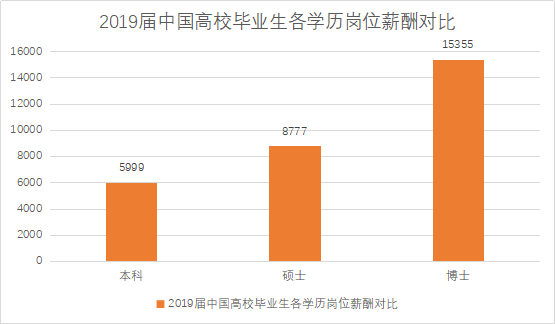 以2019年各學歷層次的崗位薪酬為例,本科生的平均崗位薪酬為5999元,碩士生的崗位薪酬為8777元,博士生的崗位薪酬平均為15355元。碩士學歷層次和本科學歷層次之間的平均崗位薪酬差距為2778元,接近本科生平均崗位薪酬的一半,而博士和碩士之間的平均崗位薪酬差更高達6721元。每當學歷層次上升一臺階都將帶來薪酬水平的一大跨越。