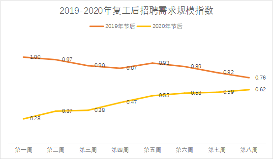 往年的三四月份是求職者們眼中的“金三銀四”,但是今年三月的招聘市場卻略顯蕭瑟。根據(jù)智聯(lián)招聘發(fā)布的數(shù)據(jù)顯示,今年企業(yè)的春招需求出現(xiàn)斷崖式下降,春節(jié)后復工第1周的招聘需求規(guī)模僅為2019年同期的28%。隨著企業(yè)復工復產(chǎn)招聘需求有所回升,但是直到復工后的第八周需求依然較往年有極大差距。就目前數(shù)據(jù)來看,今年的春招整體需求規(guī)模僅為去年的一半。