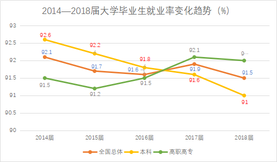 在招聘需求規(guī)模下降的同時,應屆生人數(shù)卻屢創(chuàng)歷史新高。據(jù)教育部官網(wǎng)信息,2020屆高校畢業(yè)生規(guī)模預計將達到874萬人,同比增加40萬人。同時,根據(jù)麥可思研究院發(fā)布的《2019年中國大學生就業(yè)報告》數(shù)據(jù)顯示,本科畢業(yè)生的就業(yè)率呈現(xiàn)持續(xù)緩慢下降的現(xiàn)象,2018屆本科畢業(yè)生就業(yè)率為91.0%。