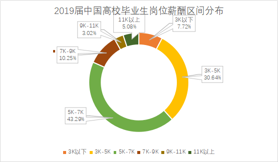 此外,根據(jù)梧桐果相關數(shù)據(jù)顯示,2019屆中國高校畢業(yè)生崗位薪酬區(qū)間的主流分布區(qū)間為5000—7000元,占比43.29%;而3000-5000元區(qū)間和3000元以下區(qū)間的占比分別為30.64%和7.72%,近四成應屆畢業(yè)生的崗位薪酬還未達到5000元;7000元以上區(qū)間的占比為18.35%,其中11000元以上的占比僅為5.08%,高薪者極少。