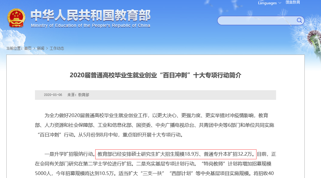 以上就是“教育部公布碩士研究生擴(kuò)大招生規(guī)模18.9萬、普通專升本擴(kuò)招32.2萬”全部內(nèi)容,希望對你有幫助!