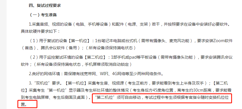 中國人民大學(xué)信息學(xué)院、歷史學(xué)院等學(xué)院要求,第二機(jī)位強(qiáng)調(diào)必須是可移動的。主機(jī)位跟上海交大、北京航空航天大學(xué)等大多數(shù)院校一樣,要求是電腦。第二機(jī)位則可以是手機(jī)或pad等平板設(shè)備。