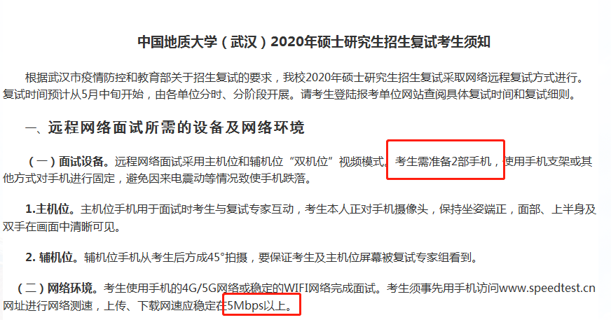 還有一些高校,比如中國地質(zhì)大學(xué)(武漢)、武漢理工大學(xué),要求雙機(jī)位都必須使用手機(jī),并且規(guī)定了上傳、下載網(wǎng)速應(yīng)穩(wěn)定在5Mbps以上。同學(xué)們一定要注意院校的具體復(fù)試要求。