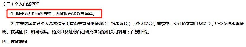根據(jù)以往的經(jīng)驗,復(fù)試需要準(zhǔn)備自我介紹。但是今年有了新的變化,部分院校要求學(xué)生準(zhǔn)備1000-3000字的自傳或時長5分鐘的PPT。