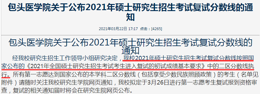 經(jīng)我校研究生招生工作領(lǐng)導(dǎo)小組研究決定,我校2021年碩士研究生招生考試復(fù)試分?jǐn)?shù)線,按照《2021年全國碩士研究生招生考試考生進(jìn)入復(fù)試的初試成績基本要求》中的二區(qū)分?jǐn)?shù)線執(zhí)行。
