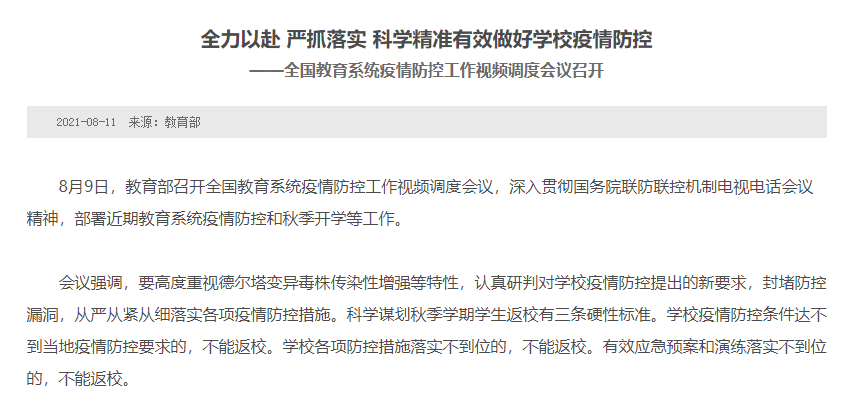 最近,隨著國內(nèi)疫情形勢的加重、大學(xué)生返校日期的逐漸臨近,疫情防控形勢越發(fā)嚴(yán)峻。教育部于8月9日召開全國教育系統(tǒng)疫情防控工作視頻調(diào)度會議,深入貫徹國務(wù)院聯(lián)防聯(lián)控機(jī)制電視電話會議精神,部署近期教育系統(tǒng)疫情防控和秋季開學(xué)等工作,一起來看!
