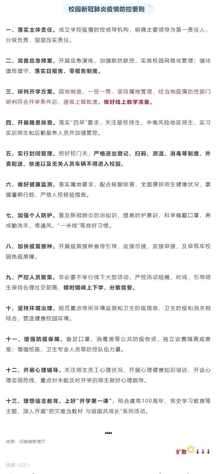 文中明確指出:因地制宜、一校一策,堅持屬地管理,經(jīng)當(dāng)?shù)匾咔榉揽夭块T研判符合開學(xué)條件后,逐級上報批準(zhǔn)。做好線上教學(xué)準(zhǔn)備。