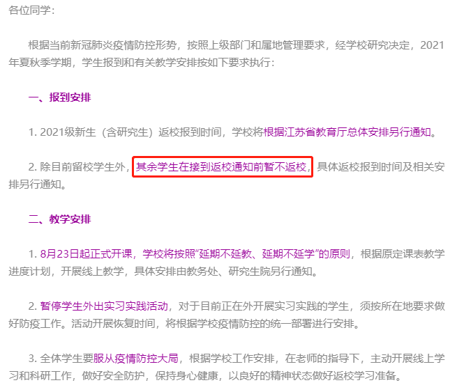 《通知》指出:學(xué)校研究決定,2021-2022學(xué)年秋季學(xué)期開學(xué)實行線上報到、網(wǎng)上授課,推遲線下報到時間,具體事宜另行通知。未經(jīng)批準(zhǔn),所有同學(xué)一律不得提前返校。