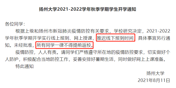8月11日,揚州大學(xué)官方微信公眾號發(fā)布《揚州大學(xué)2021-2022學(xué)年秋季學(xué)期學(xué)生開學(xué)通知》。