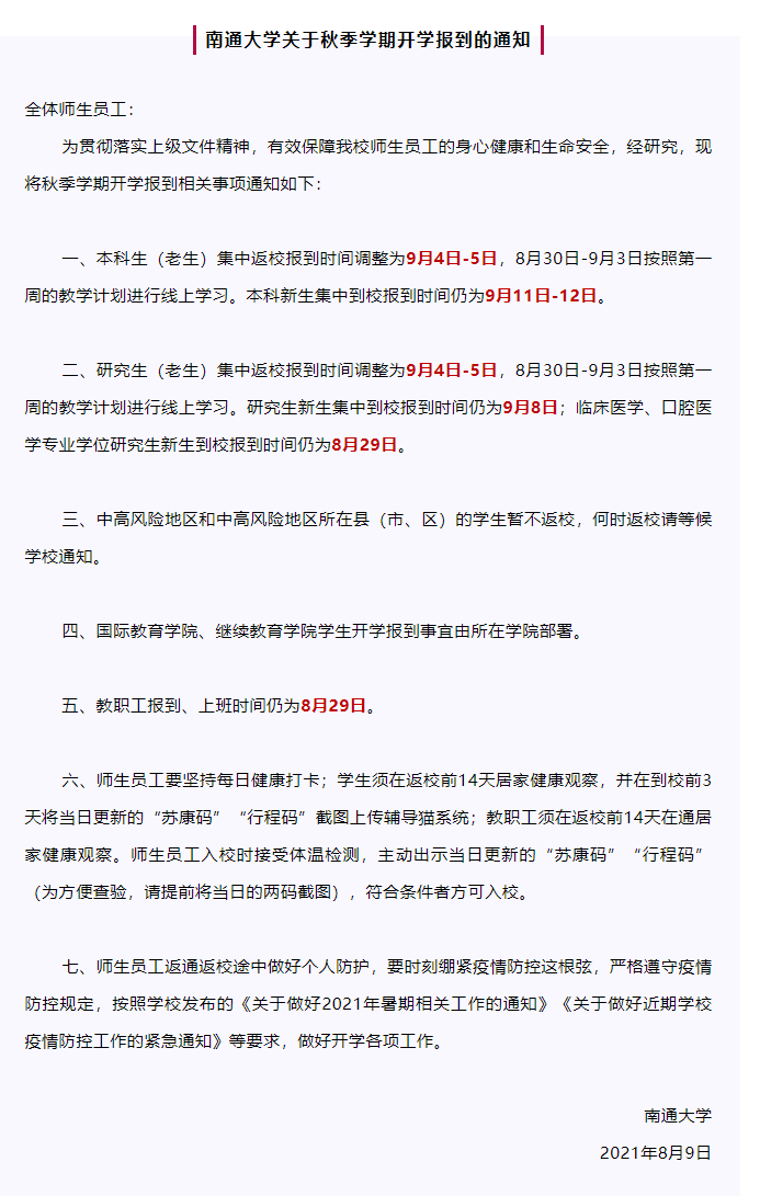 8月10日,南通大學(xué)官方微信公眾號發(fā)布《南通大學(xué)關(guān)于秋季學(xué)期開學(xué)報到的通知》。