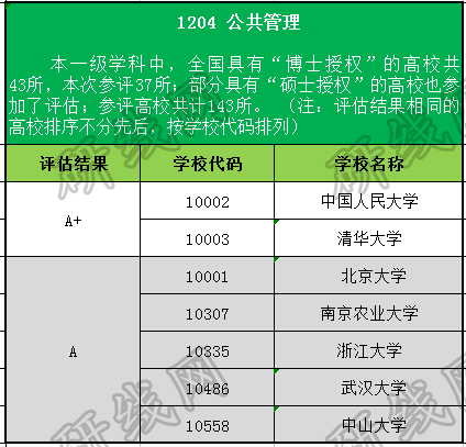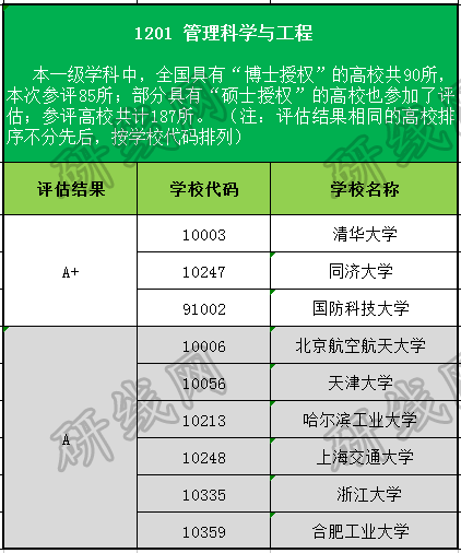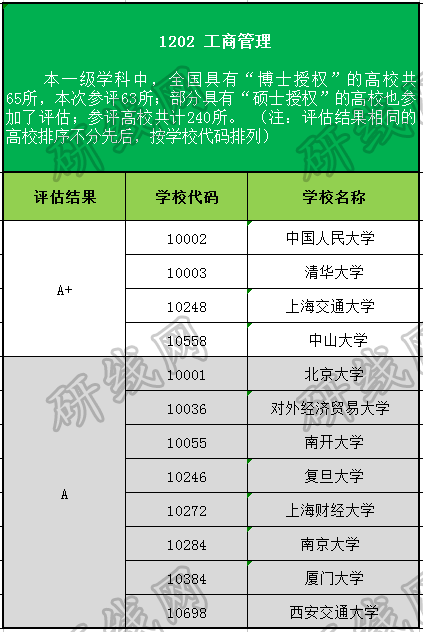 教育部學位與研究生教育發(fā)展中心于2017年12月28日公布全國第四輪學科評估結果,其中管理學類學科高校評估結果為A及A以上等級的學校名稱及代碼如下: