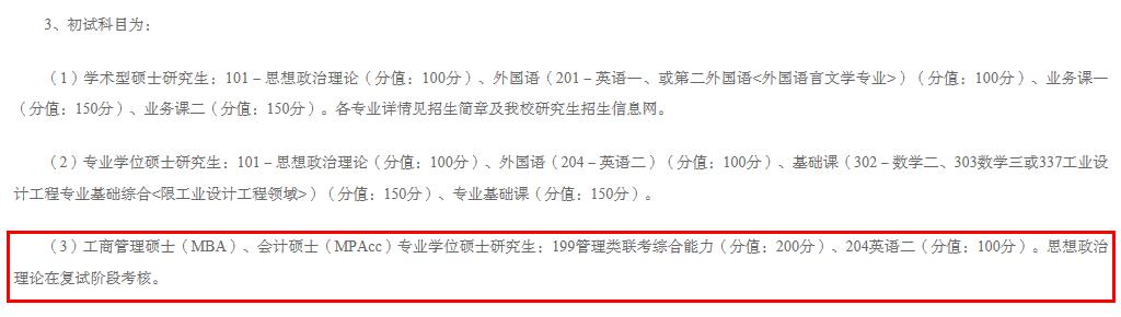 管理學學術學位類:初試考試科目一般為英語一、數(shù)學三、政治、加上一門專業(yè)課。初試分數(shù)構成為英語滿分100分,數(shù)學滿分為150分,專業(yè)課滿分150分。以浙江工商大學為例: