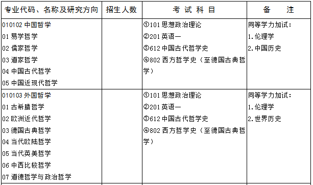 哲學學科門類考試科目:初試考試科目一般為政治、英語一,加兩門專業(yè)課,專業(yè)課基本上是招生單位自主命題,查看報考學校公布的碩士專業(yè)目錄或者考試大綱、參考書目即可了解初試科目。分數(shù)構(gòu)成為政治滿分100分,英語滿分100分,專業(yè)課一滿分150分,專業(yè)課二滿分150分,總分為500分,以山東大學為例: