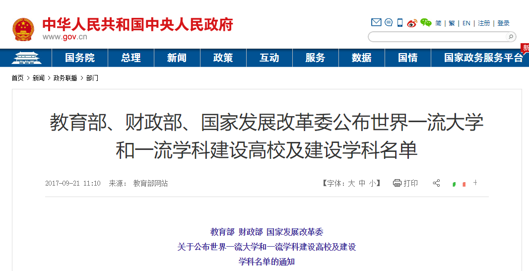 根據(jù)國務(wù)院《統(tǒng)籌推進(jìn)世界一流大學(xué)和一流學(xué)科建設(shè)總體方案》以及教育部等三部委《統(tǒng)籌推進(jìn)世界一流大學(xué)和一流學(xué)科建設(shè)實(shí)施辦法(暫行)》,經(jīng)專家委員會遴選認(rèn)定,教育部、財政部、國家發(fā)展改革委研究并報國務(wù)院批準(zhǔn),現(xiàn)公布世界一流大學(xué)和一流學(xué)科(簡稱“雙一流”)建設(shè)高校及建設(shè)學(xué)科名單。