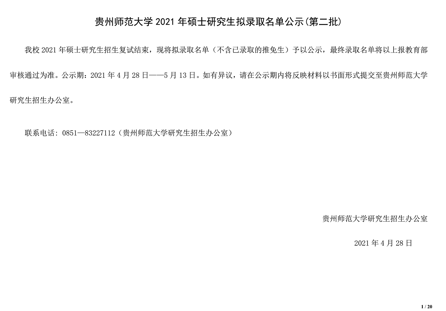2021考研擬錄取名單:貴州師范大學(xué)2021年碩士研究生擬錄取名單公示(第二批)”的相關(guān)內(nèi)容,希望能對(duì)大家有所幫助。