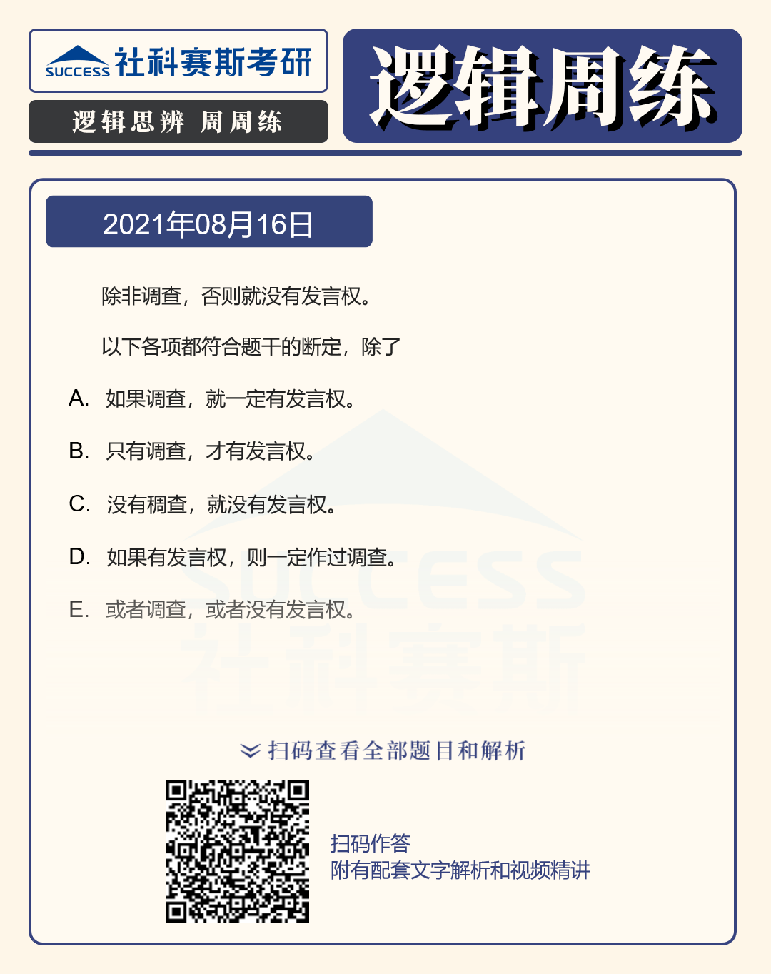 邏輯思辨周周練,考研邏輯專(zhuān)項(xiàng)練習(xí),攻克邏輯難關(guān)!今天社科賽斯考研網(wǎng)小編整理了“邏輯專(zhuān)項(xiàng)練習(xí):8月16日邏輯專(zhuān)項(xiàng)練習(xí)及答案”,希望能對(duì)廣大考生有所幫助!