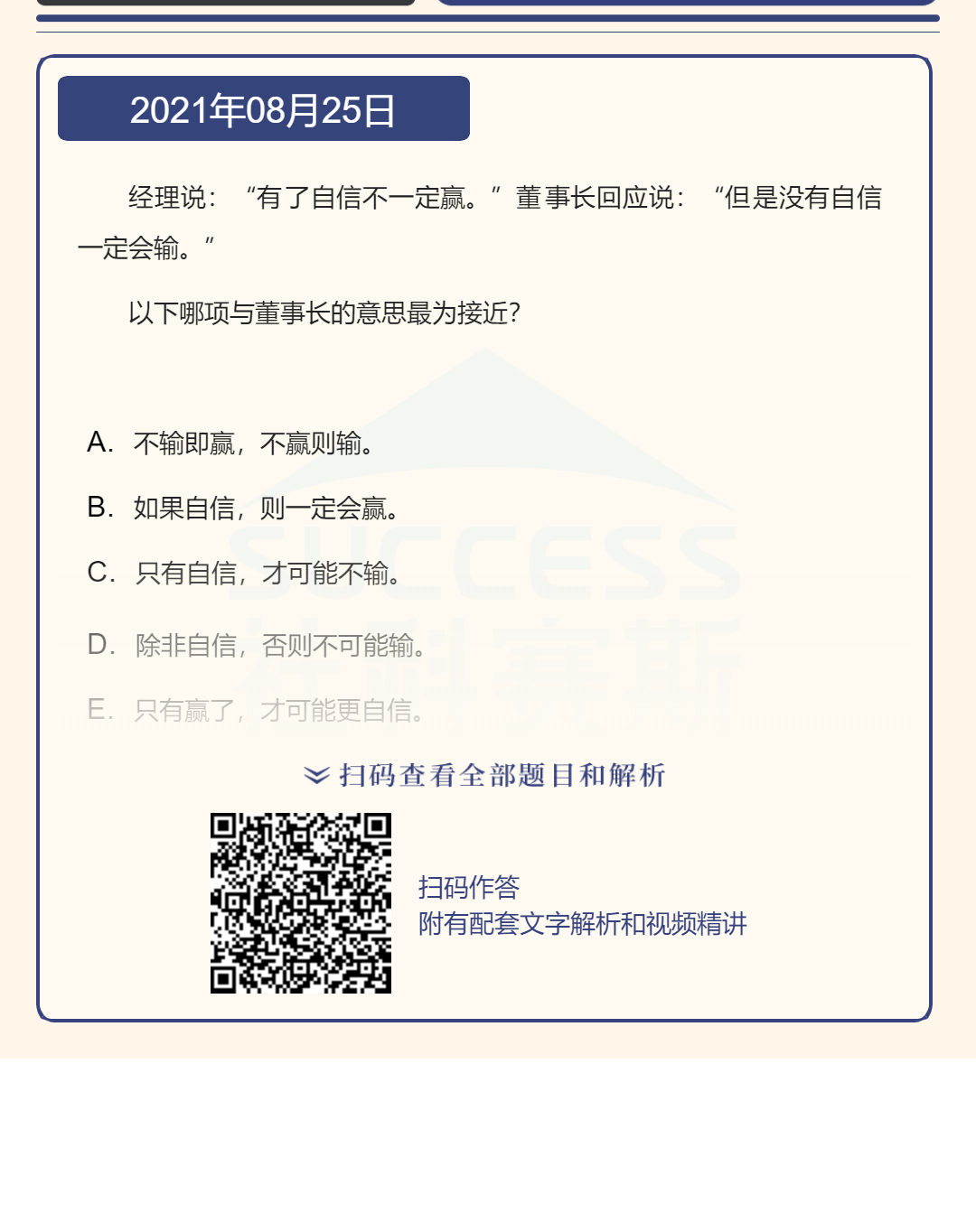 以上就是社科賽斯考研網(wǎng)小編為大家整理邏輯專項(xiàng)練習(xí):8月25日邏輯專項(xiàng)練習(xí)及答案的全部內(nèi)容,希望各位考生堅(jiān)持利用起來,想要獲取更多內(nèi)容請持續(xù)關(guān)注社科賽斯考研網(wǎng)。