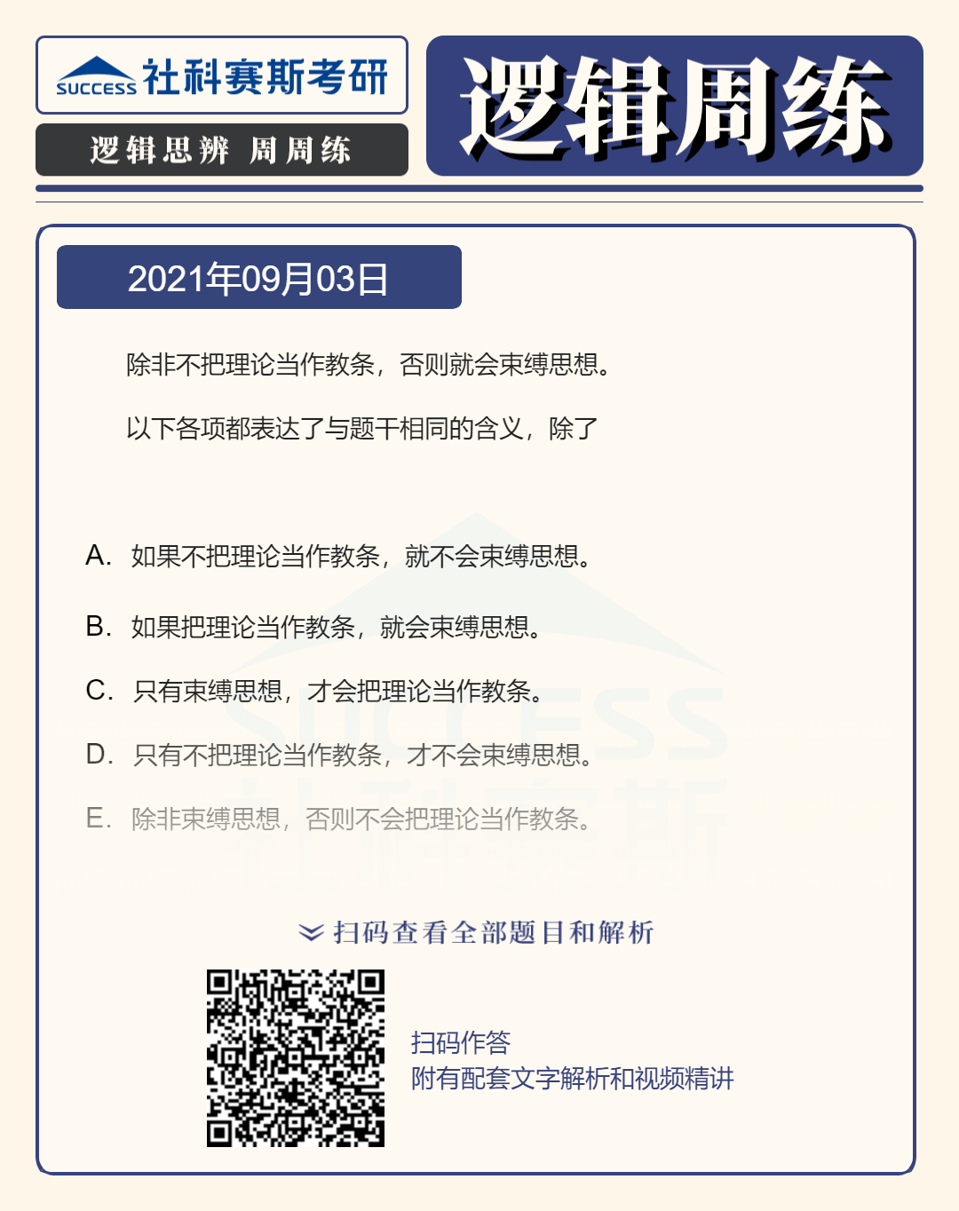 邏輯思辨周周練,考研邏輯專項練習,攻克邏輯難關!今天社科賽斯考研網(wǎng)小編整理了“邏輯專項練習:9月3日邏輯專項練習及答案”,希望能對廣大考生有所幫助!