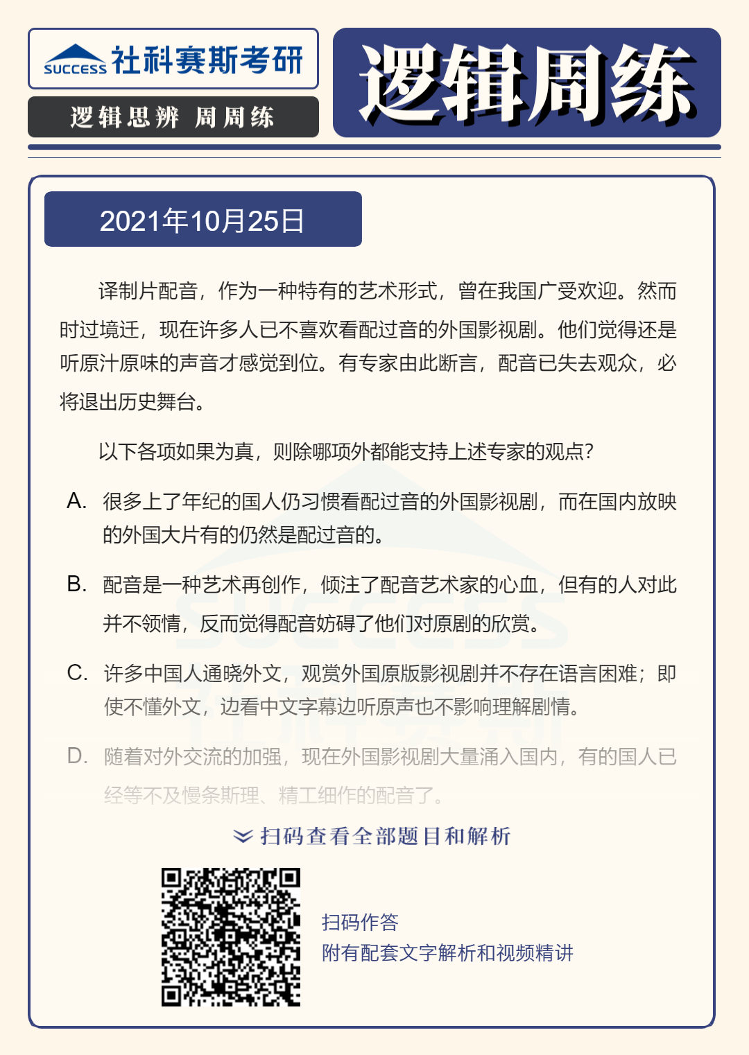 以上就是社科賽斯考研網(wǎng)小編為大家整理邏輯專項(xiàng)練習(xí):10月25日邏輯專項(xiàng)練習(xí)及答案的全部內(nèi)容,希望各位考生堅(jiān)持利用起來,想要獲取更多內(nèi)容請持續(xù)關(guān)注社科賽斯考研網(wǎng)。