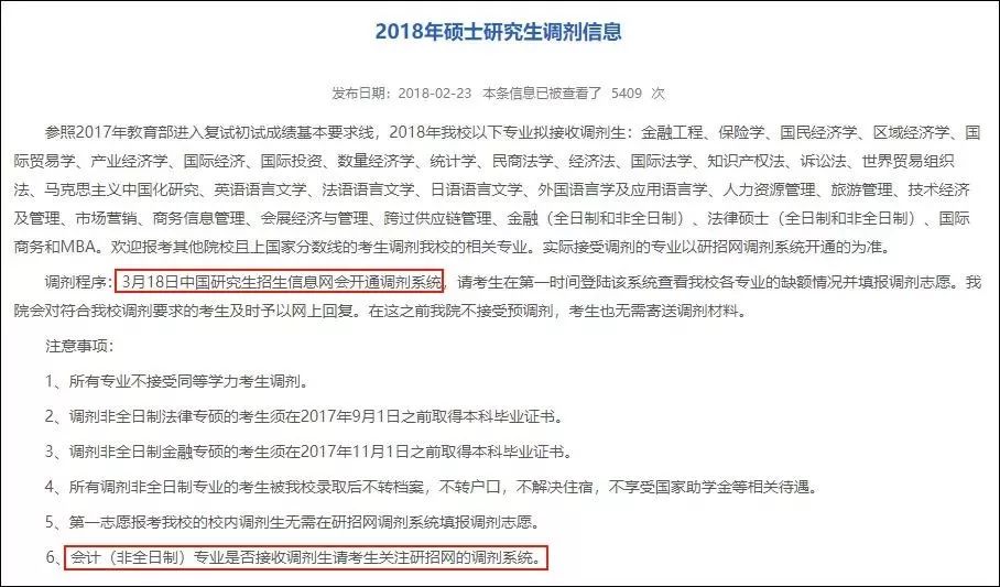 根據(jù)近幾年的習(xí)慣來看,研招網(wǎng)調(diào)劑系統(tǒng)的開通時間一般都在3月18日左右,比如,17年考研就是在3月17日開通的。 01 調(diào)劑系統(tǒng)3月18日開通 今年研招網(wǎng)調(diào)劑系統(tǒng)開通時間官方還沒有給出明確說法,但在2月23日上海對外經(jīng)貿(mào)大學(xué)研究生院網(wǎng)站發(fā)布的“2018年碩士研究生調(diào)劑信息”中提到: 3月18日中國研究生招生信息網(wǎng)會開通調(diào)劑系統(tǒng),請考生在第一時間登陸該系統(tǒng)查看我校各專業(yè)的缺額情況并填報調(diào)劑志愿。