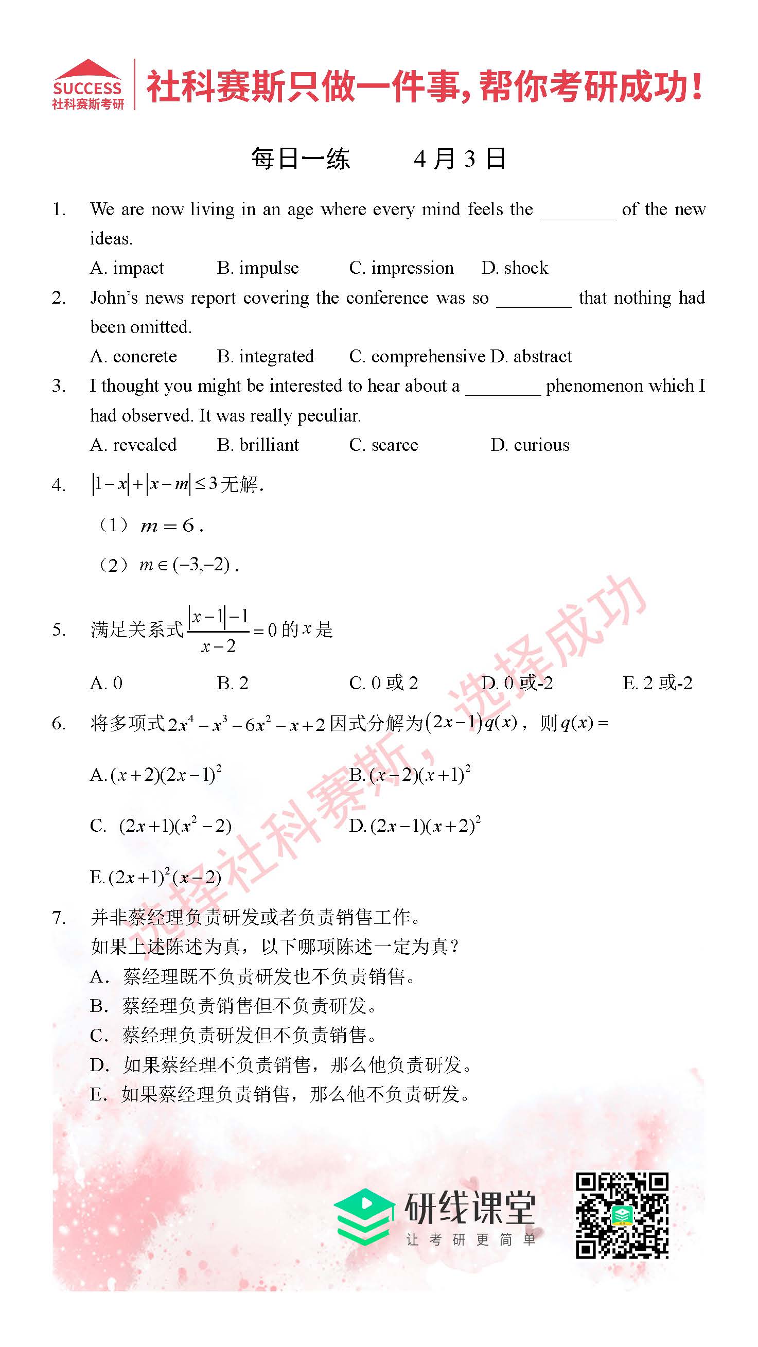 考研是一場持久戰(zhàn),保持良好的學習習慣,是能確保復習高效的關鍵。MBA備考網(wǎng)小編整理了管綜的每日一練,希望能對廣大考生有所幫助。