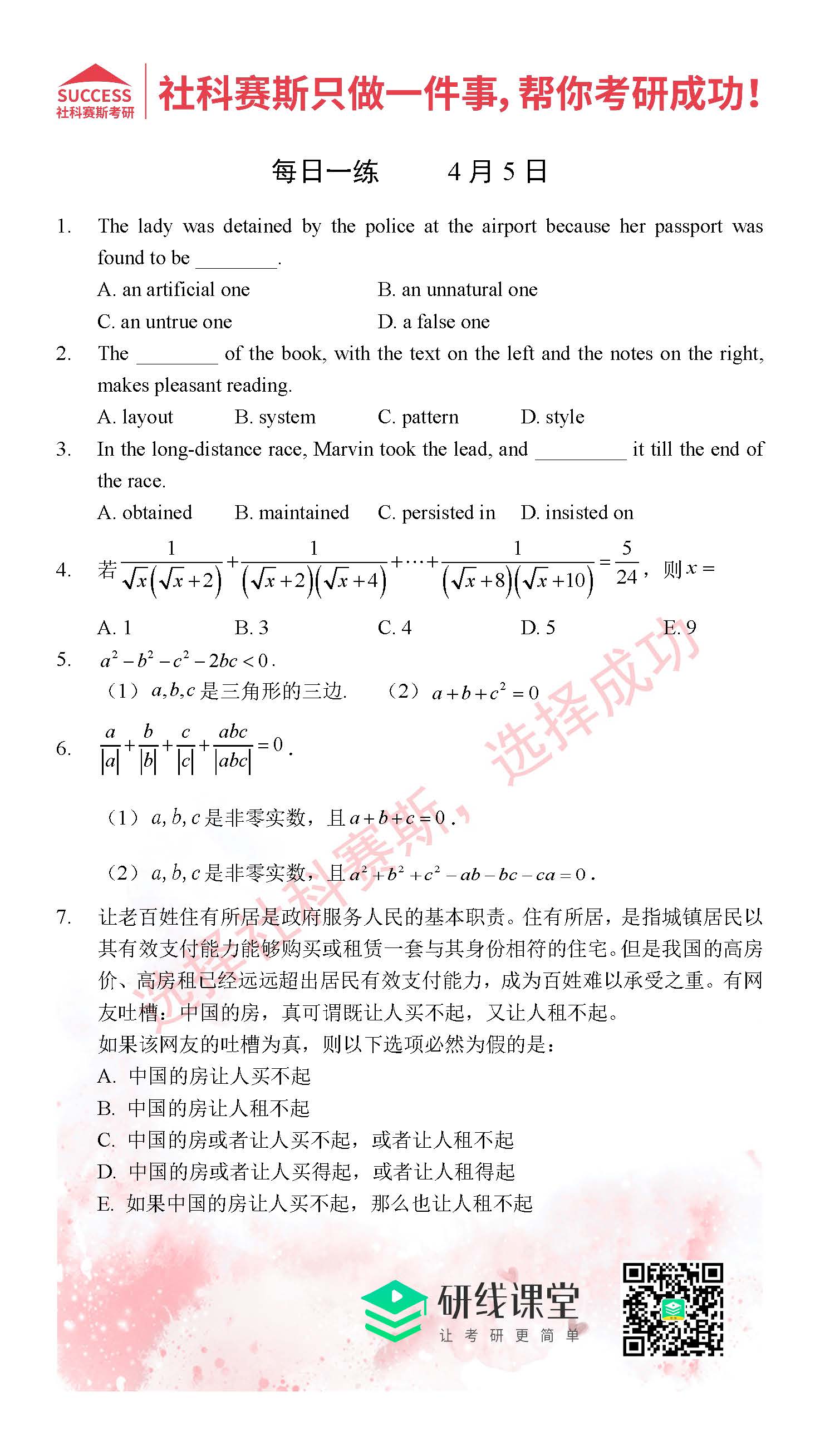 考研是一場持久戰(zhàn),保持良好的學(xué)習(xí)習(xí)慣,是能確保復(fù)習(xí)高效的關(guān)鍵。MBA備考網(wǎng)小編整理了管綜的每日一練,希望能對廣大考生有所幫助。
