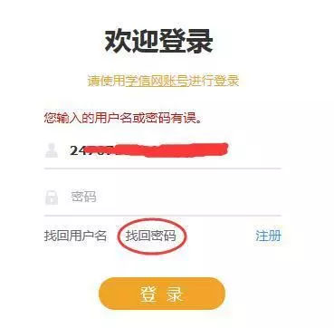 一、沒有學(xué)信網(wǎng)賬號(hào) 大學(xué)時(shí)涉及到學(xué)信檔案(含畢業(yè)證書圖像校對(duì)、學(xué)籍信息核對(duì)等),所以大多本科畢業(yè)生都會(huì)有學(xué)信網(wǎng)賬號(hào);但如果您確實(shí)沒有,還是必須要注冊(cè)噠,畢竟這是研招網(wǎng)報(bào)唯一可使用的賬號(hào)。 注冊(cè)網(wǎng)址: https://account.chsi.com.cn/account/preregister.action 注冊(cè)時(shí)請(qǐng)注意以下兩點(diǎn): ① 注冊(cè)學(xué)信網(wǎng)賬號(hào)必須實(shí)名本人身份證號(hào); ② 用自己的手機(jī)號(hào)和郵箱注冊(cè),并完成郵箱綁定,以免日后忘記密碼時(shí),原本手機(jī)號(hào)已停用或者忘記密保問題無法找回。 二、學(xué)信網(wǎng)賬號(hào)異常 有學(xué)信網(wǎng)賬號(hào),但忘記密碼: 1、找回密碼 登錄時(shí)使用手機(jī)號(hào)/身份證號(hào)/郵箱,輸入密碼之后,提示:您輸入的用戶名或密碼有誤。