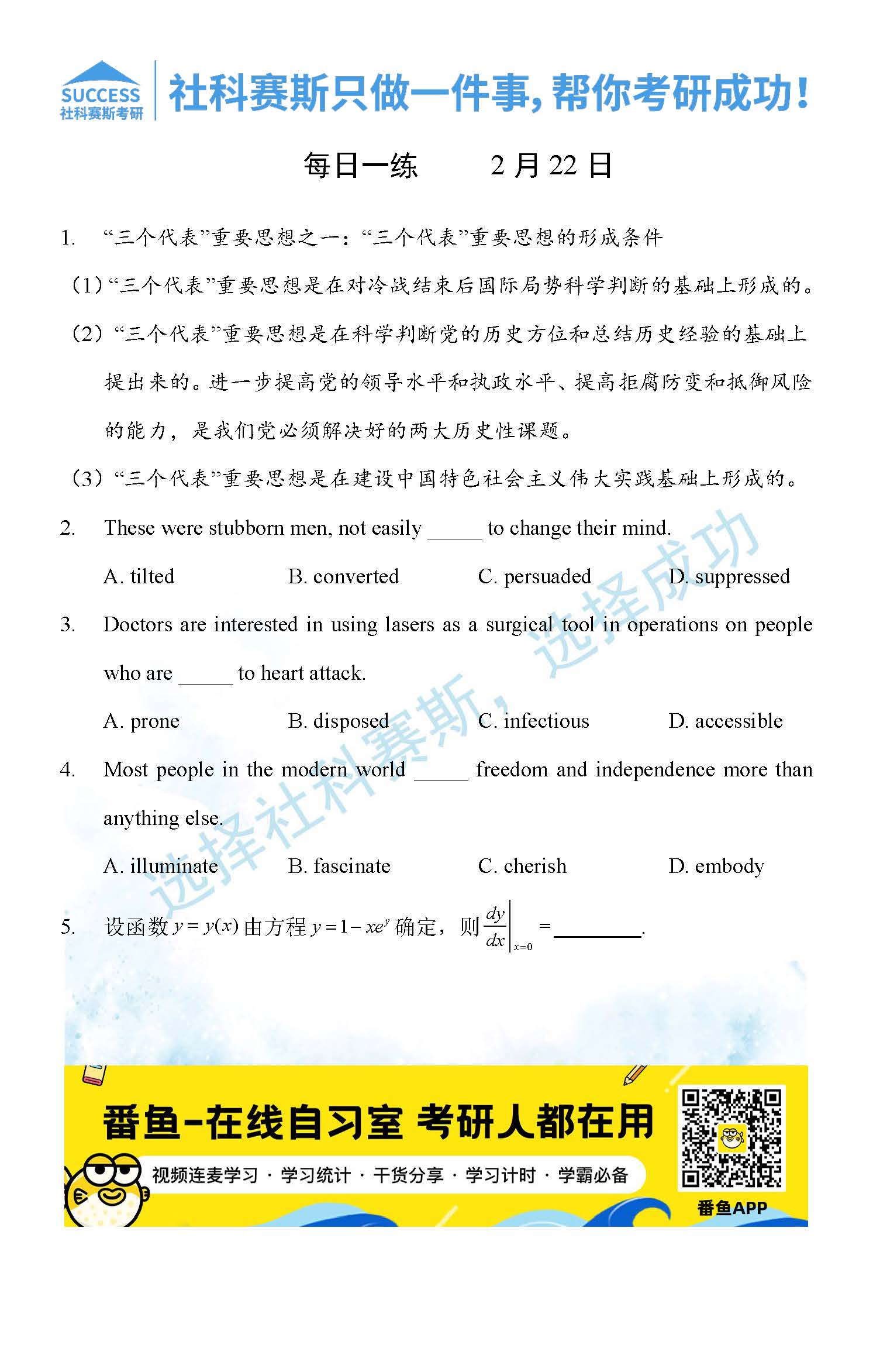 考研是一場持久戰(zhàn),保持良好的學(xué)習(xí)習(xí)慣,是能確保復(fù)習(xí)高效的關(guān)鍵。今天社科賽斯考研網(wǎng)小編整理了“2022考研每日一練:2月22日每日一練及答案”的內(nèi)容,希望能對廣大考生有所幫助。