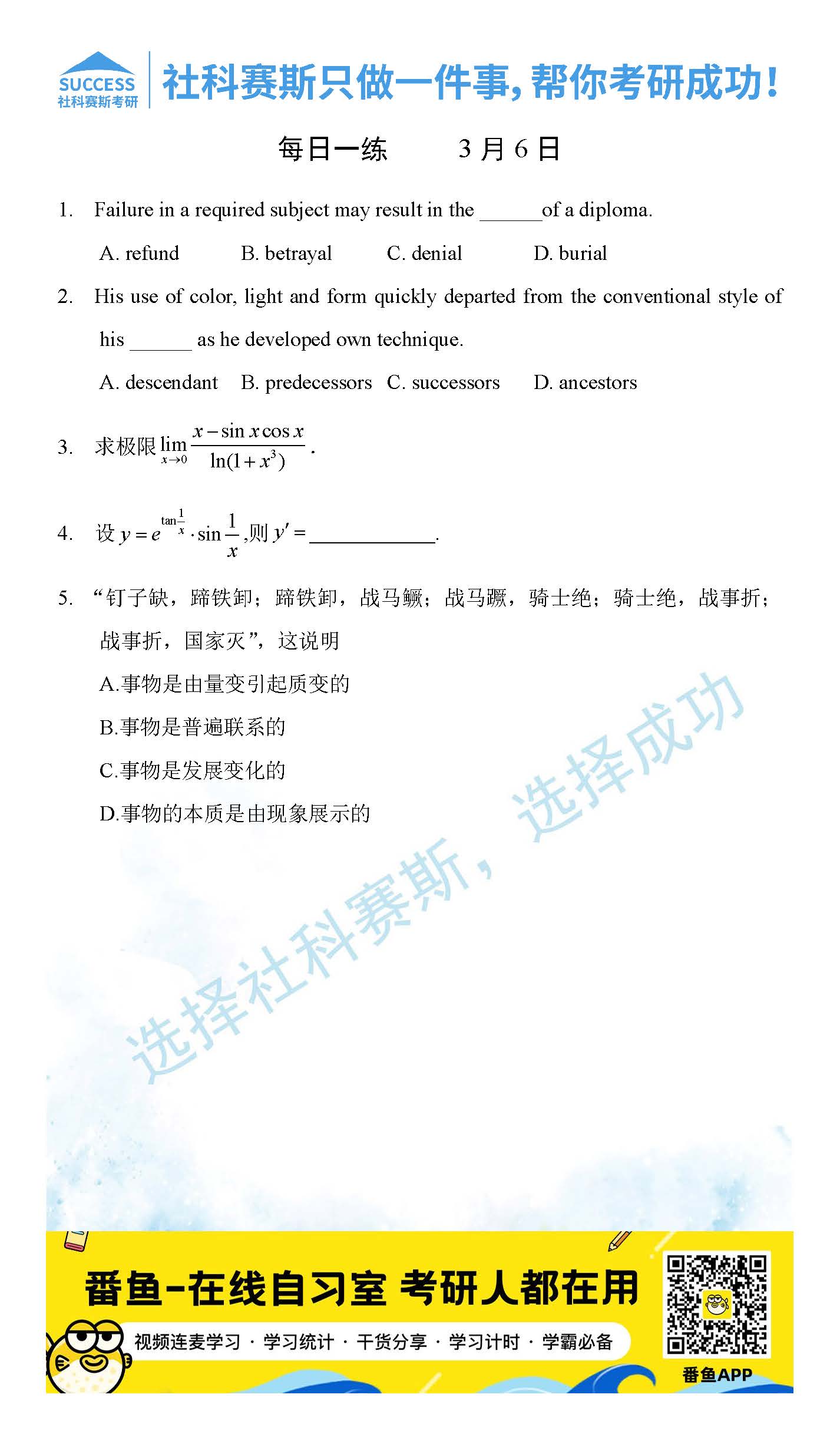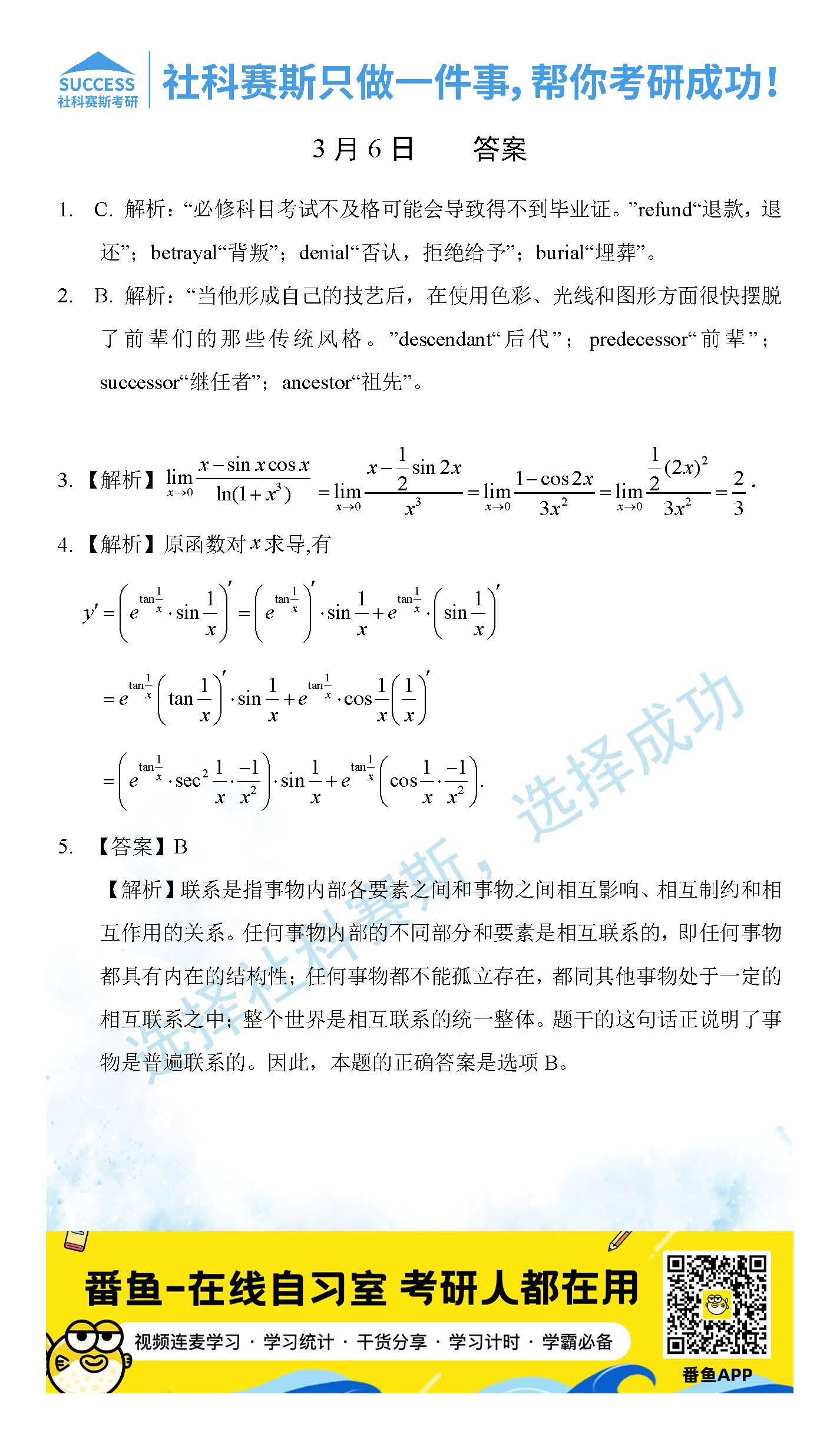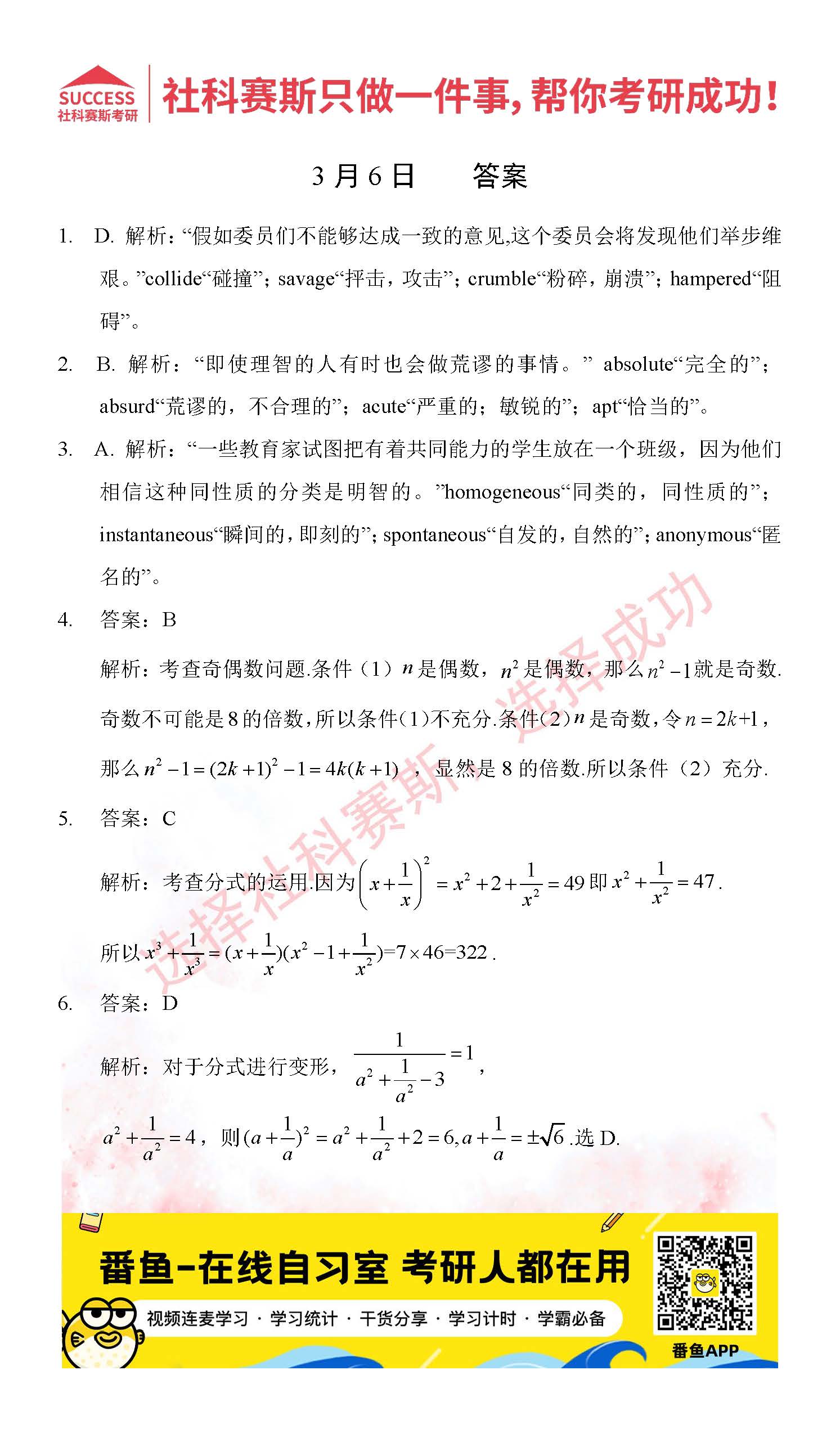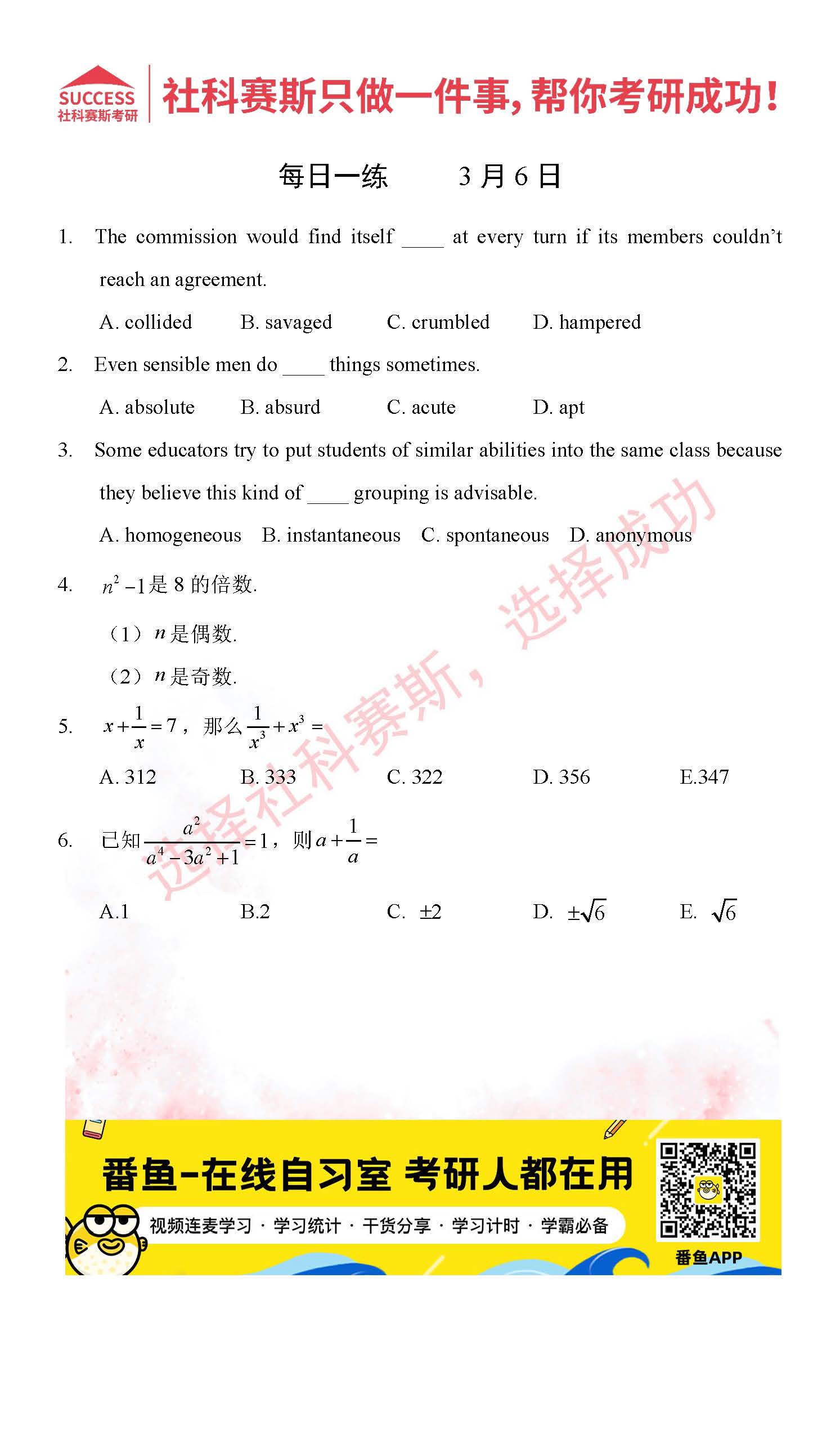 以上就是社科賽斯考研網(wǎng)小編為大家整理2022考研每日一練:3月6日管理類聯(lián)考每日一練及答案的全部?jī)?nèi)容,希望各位考生堅(jiān)持利用起來,更多每日一練內(nèi)容請(qǐng)持續(xù)關(guān)注社科賽斯考研網(wǎng)。