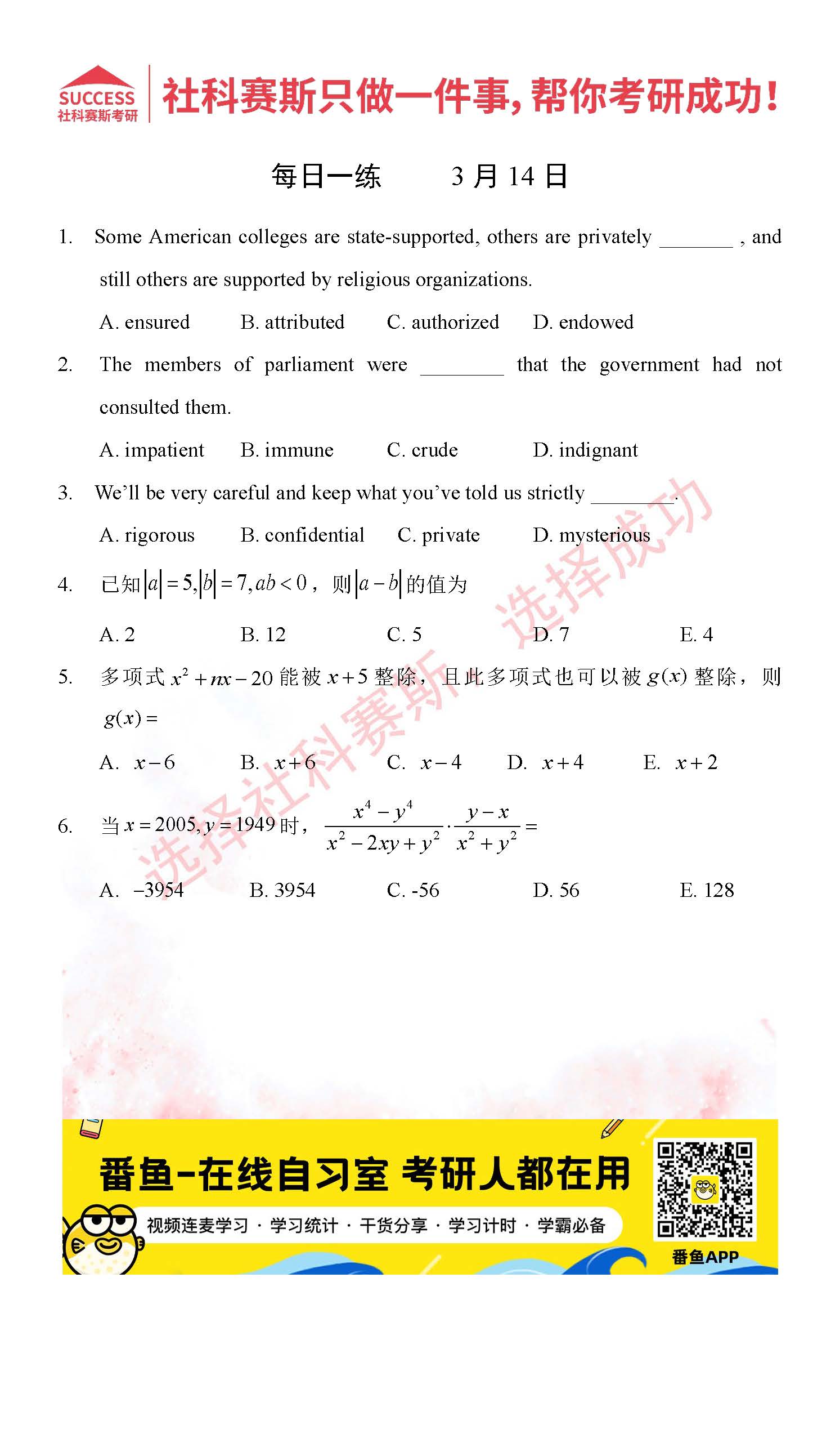 考研是一場持久戰(zhàn),保持良好的學習習慣,是能確保復習高效的關鍵。今天社科賽斯考研網小編整理了“2022考研每日一練:3月14日管理類聯(lián)考每日一練及答案”的內容,希望能對廣大考生有所幫助。