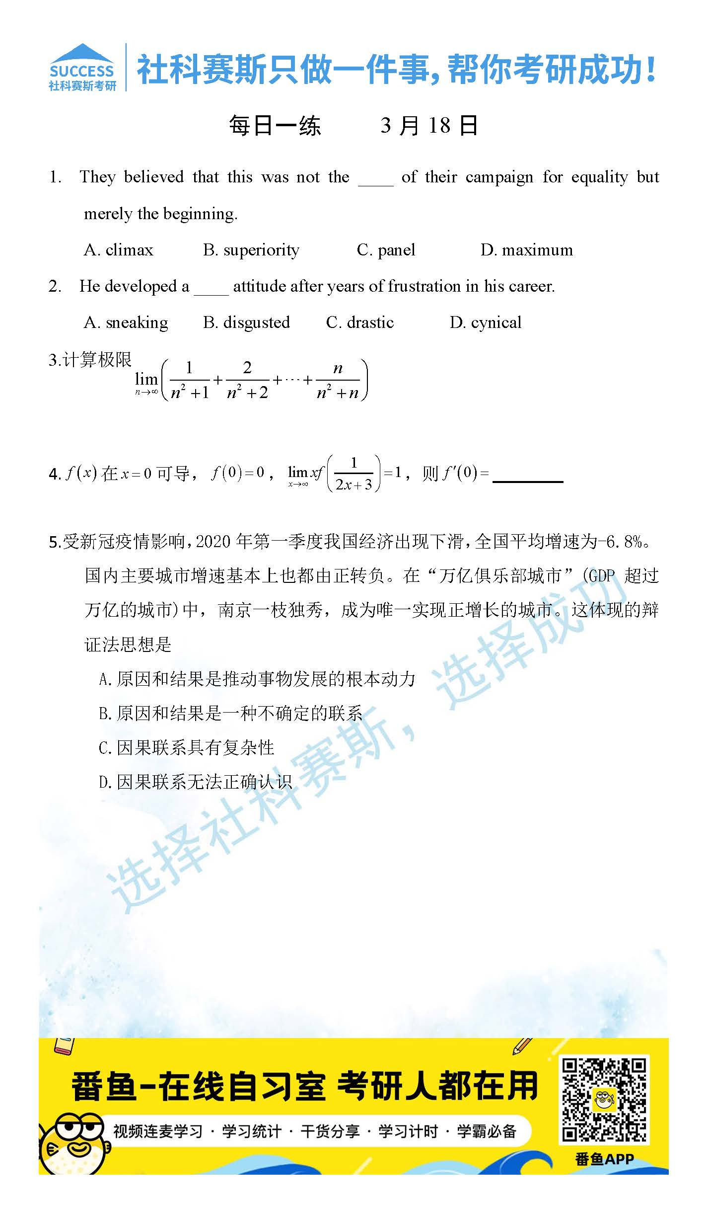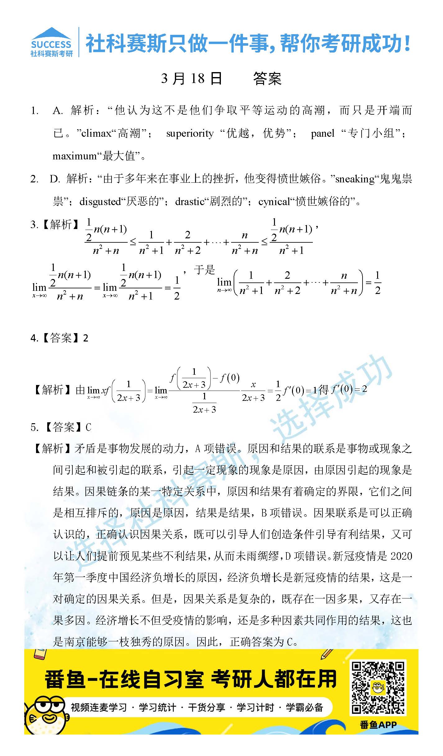 考研是一場持久戰(zhàn),保持良好的學(xué)習(xí)習(xí)慣,是能確保復(fù)習(xí)高效的關(guān)鍵。今天社科賽斯考研網(wǎng)小編整理了“2022考研每日一練:3月18日管理類聯(lián)考每日一練及答案”的內(nèi)容,希望能對廣大考生有所幫助。