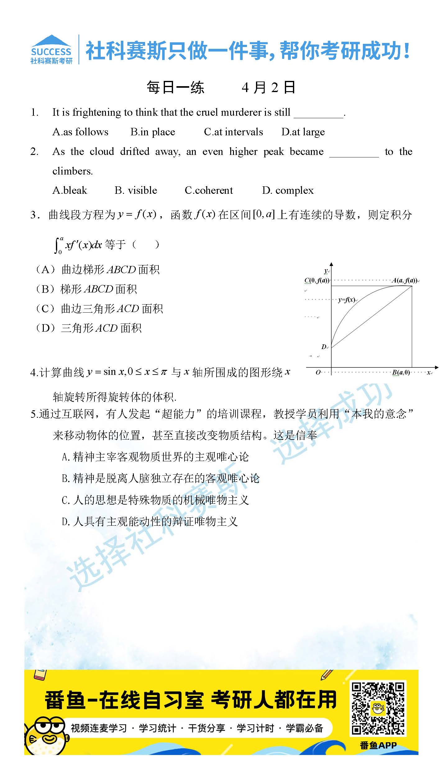 考研是一場持久戰(zhàn),保持良好的學(xué)習(xí)習(xí)慣,是能確保復(fù)習(xí)高效的關(guān)鍵。今天社科賽斯考研網(wǎng)小編整理了“2022考研每日一練:4月2日管理類聯(lián)考每日一練及答案”的內(nèi)容,希望能對(duì)廣大考生有所幫助。