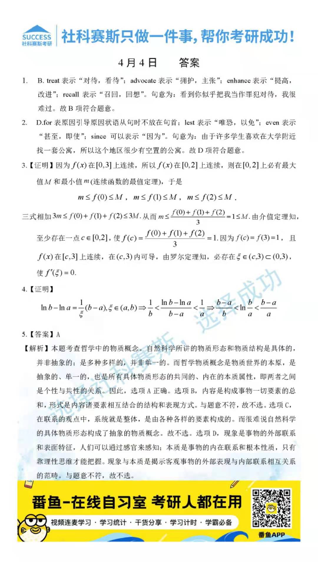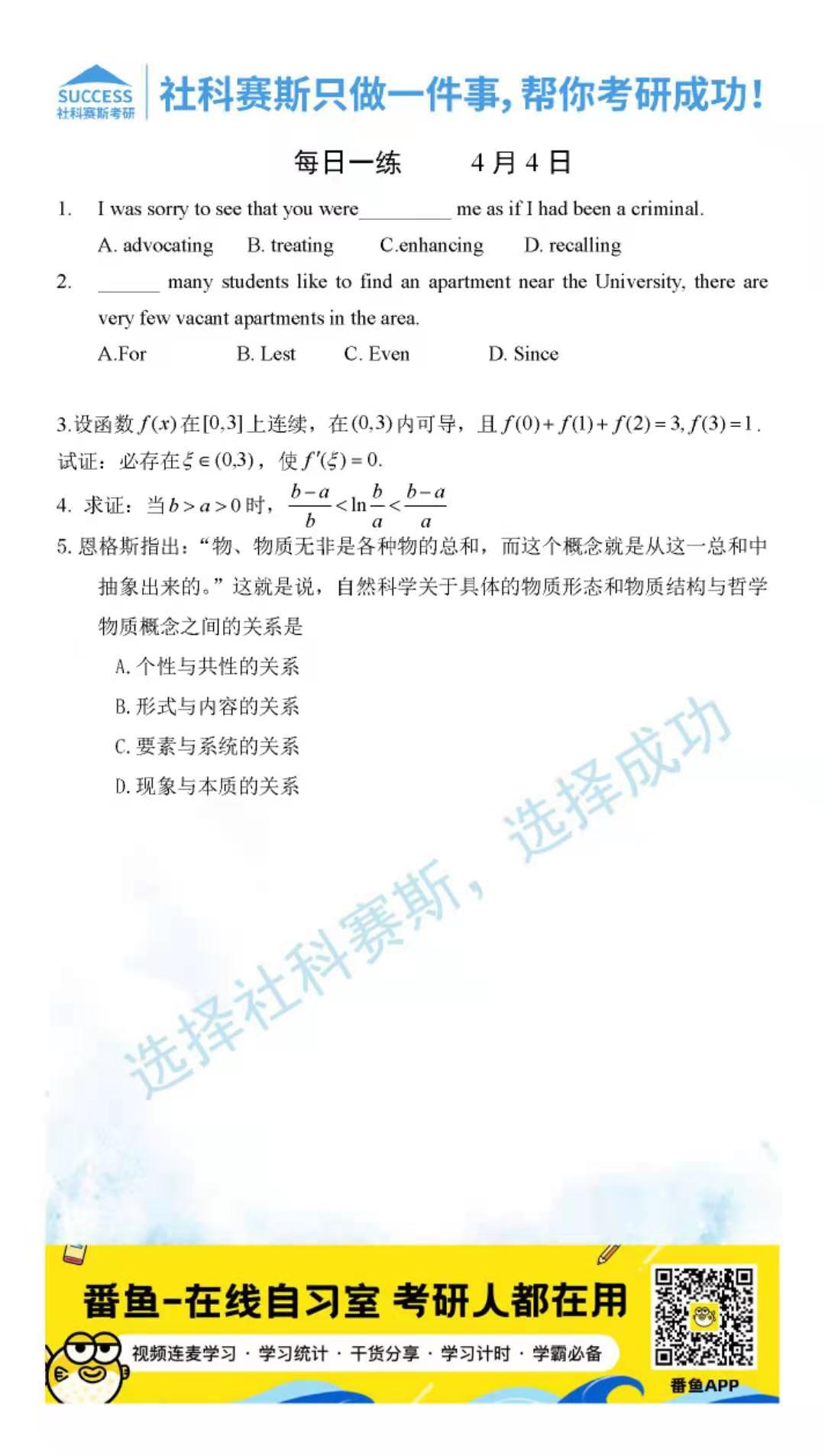 考研是一場持久戰(zhàn),保持良好的學(xué)習(xí)習(xí)慣,是能確保復(fù)習(xí)高效的關(guān)鍵。今天社科賽斯考研網(wǎng)小編整理了“2022考研每日一練:4月4日管理類聯(lián)考每日一練及答案”的內(nèi)容,希望能對廣大考生有所幫助。