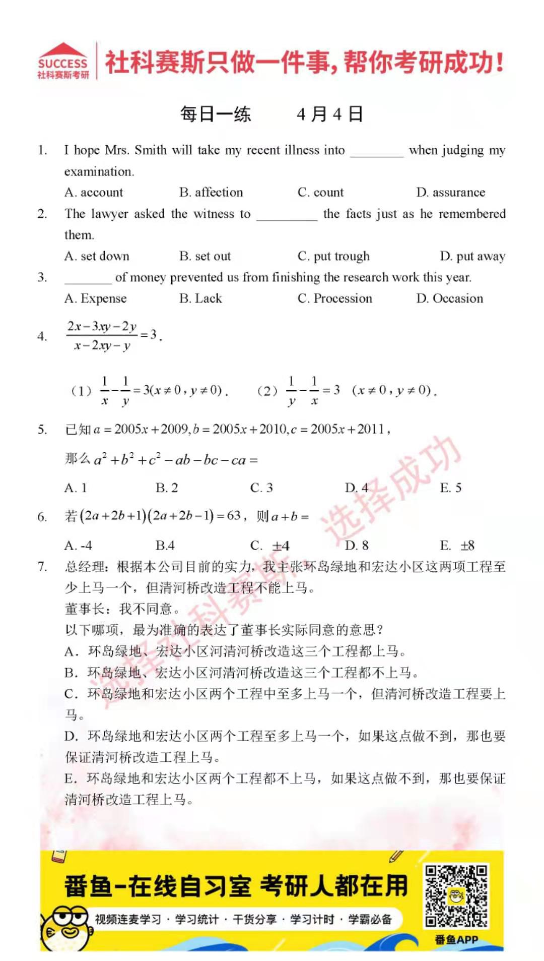 2022考研每日一練:4月4日管理類聯(lián)考每日一練及答案