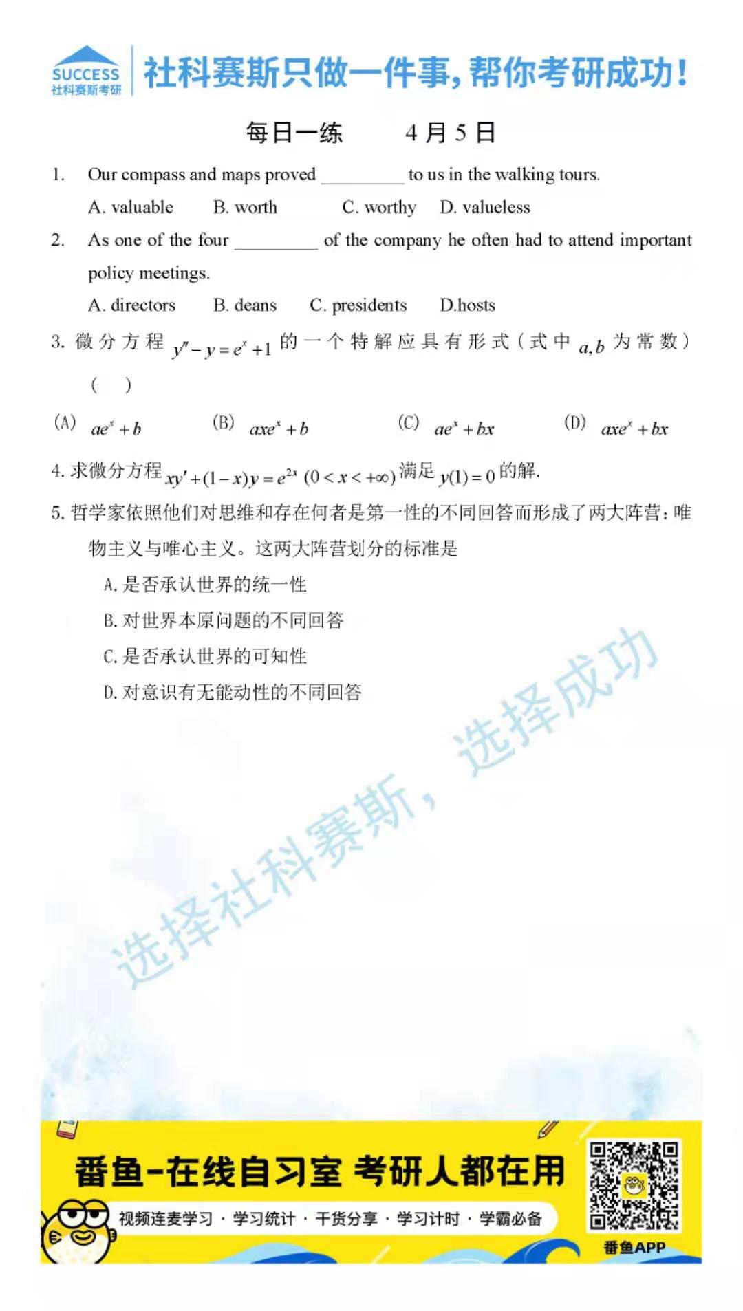 考研是一場持久戰(zhàn),保持良好的學(xué)習(xí)習(xí)慣,是能確保復(fù)習(xí)高效的關(guān)鍵。今天社科賽斯考研網(wǎng)小編整理了“2022考研每日一練:4月5日管理類聯(lián)考每日一練及答案”的內(nèi)容,希望能對廣大考生有所幫助。