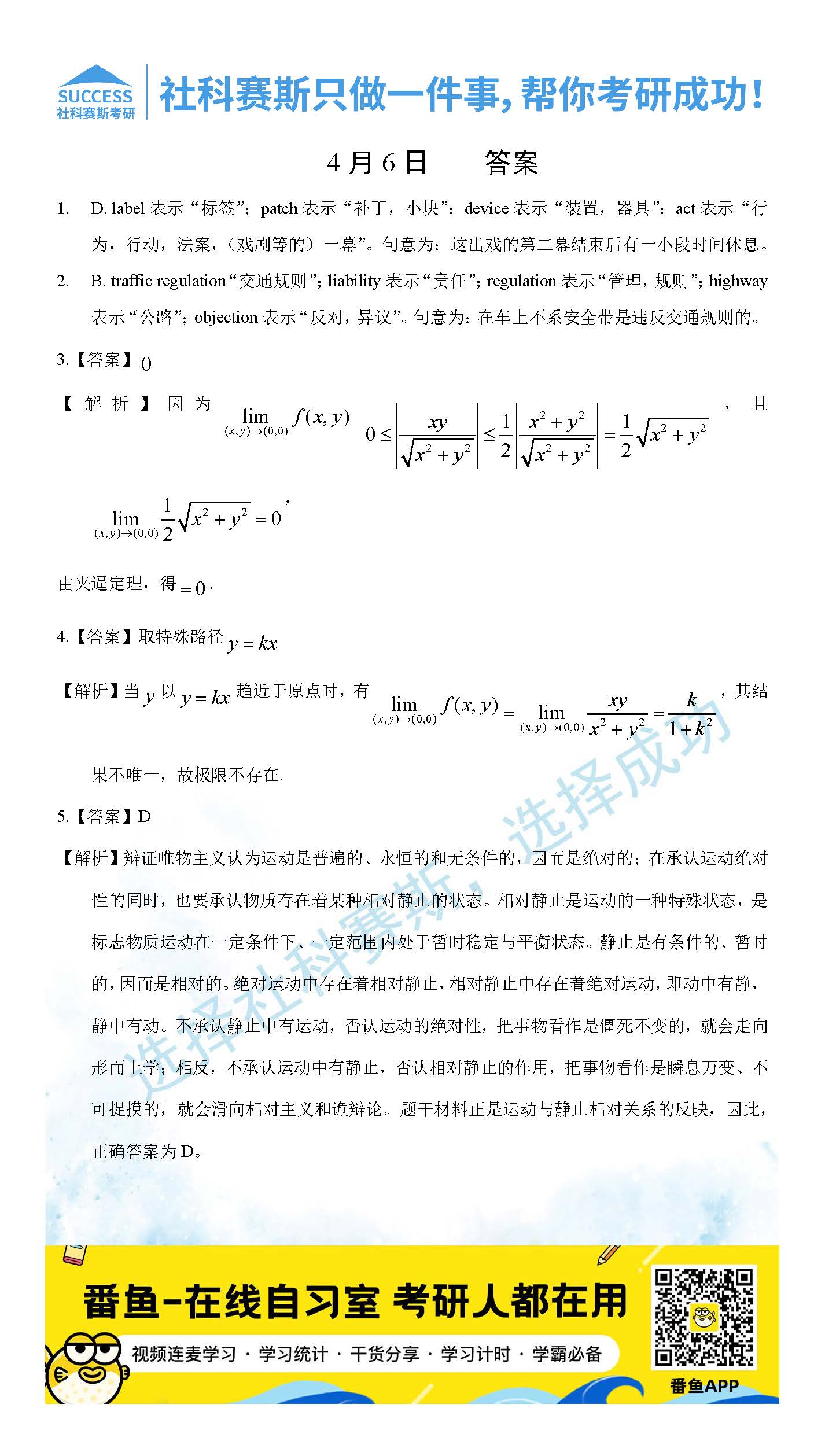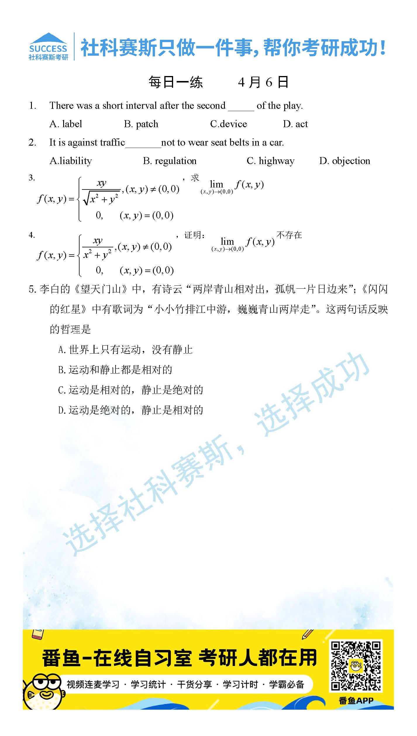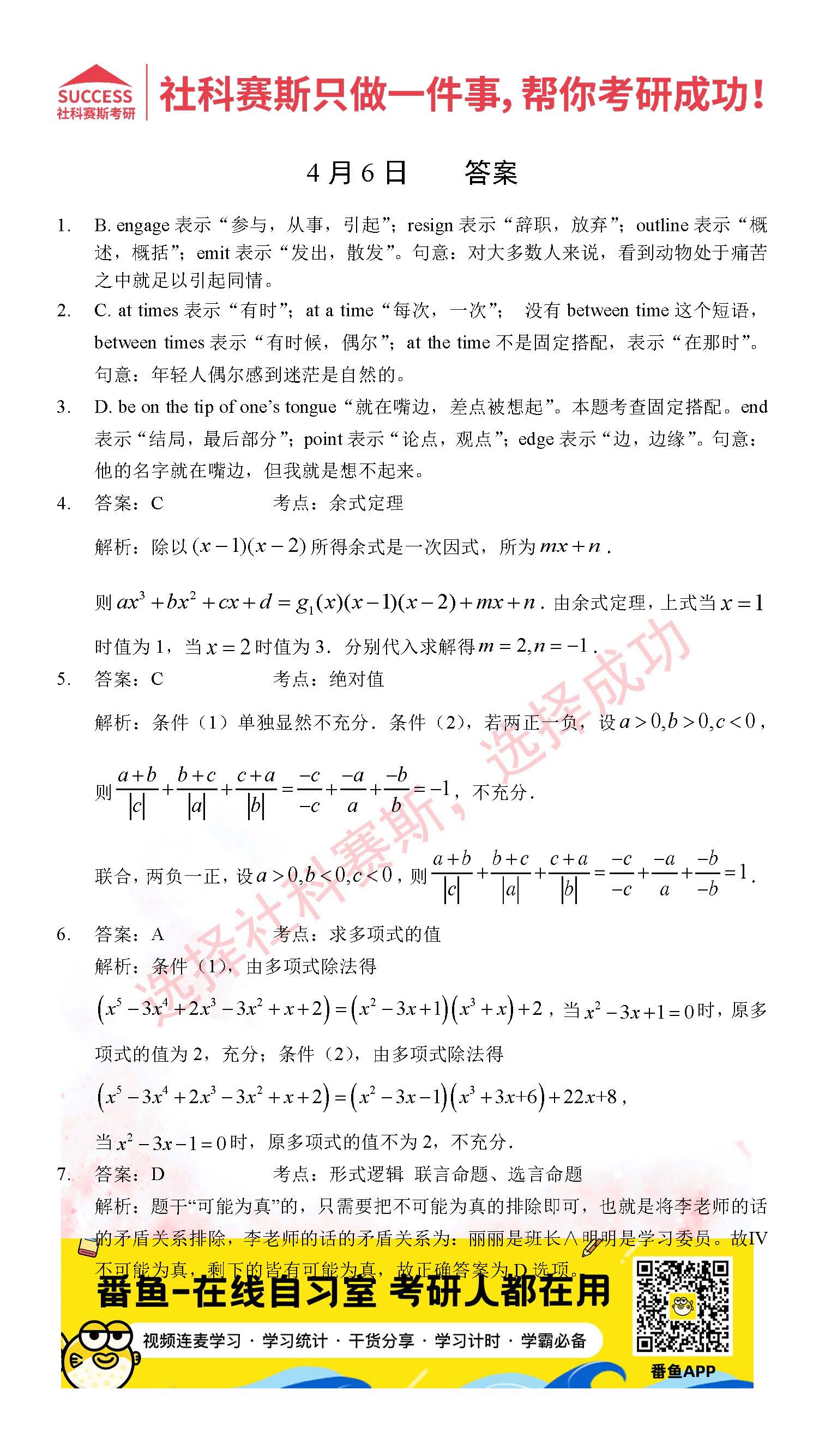 考研是一場持久戰(zhàn),保持良好的學(xué)習(xí)習(xí)慣,是能確保復(fù)習(xí)高效的關(guān)鍵。今天社科賽斯考研網(wǎng)小編整理了“2022考研每日一練:4月6日管理類聯(lián)考每日一練及答案”的內(nèi)容,希望能對廣大考生有所幫助。