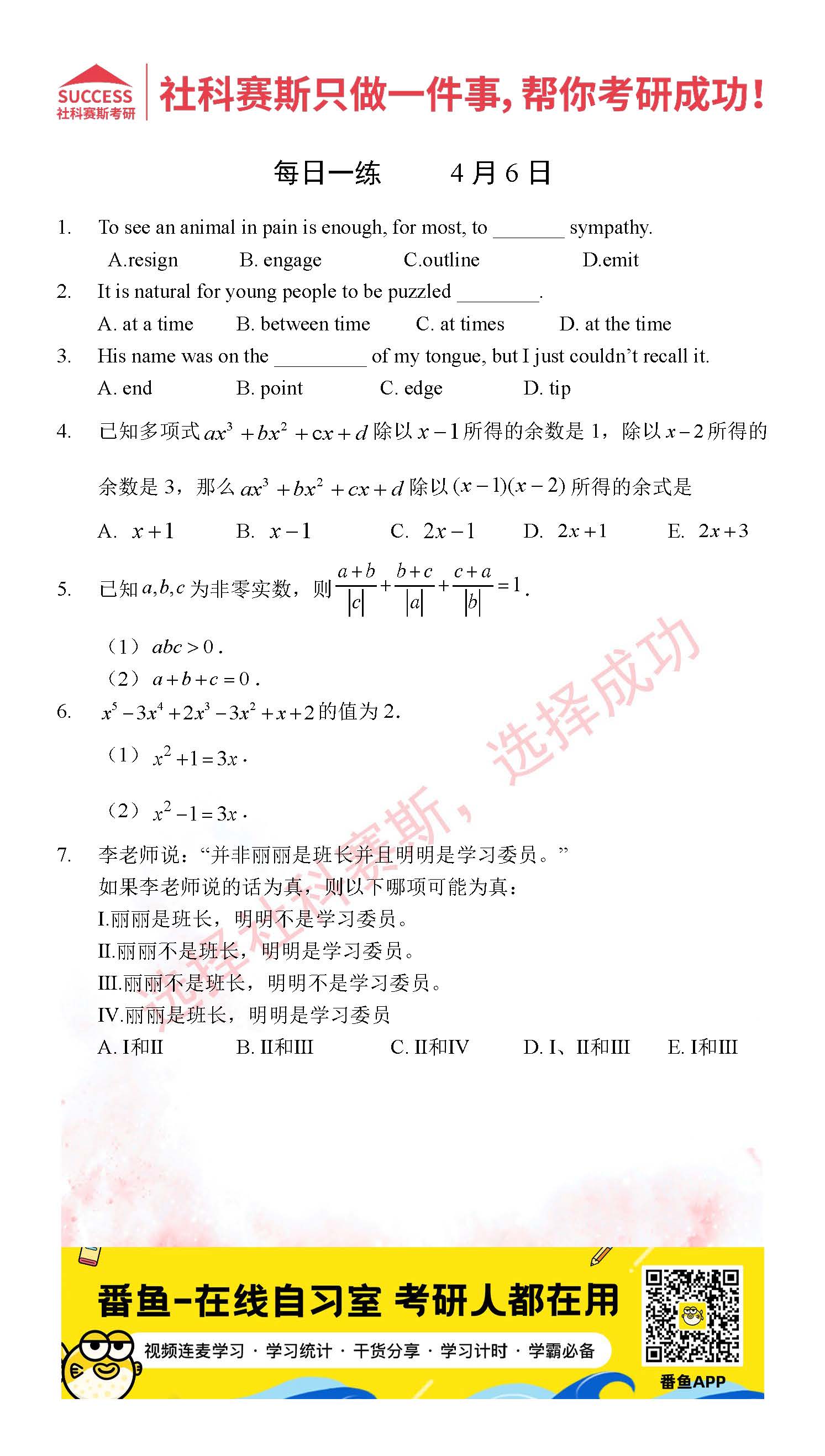 2022考研每日一練:4月6日管理類聯(lián)考每日一練及答案