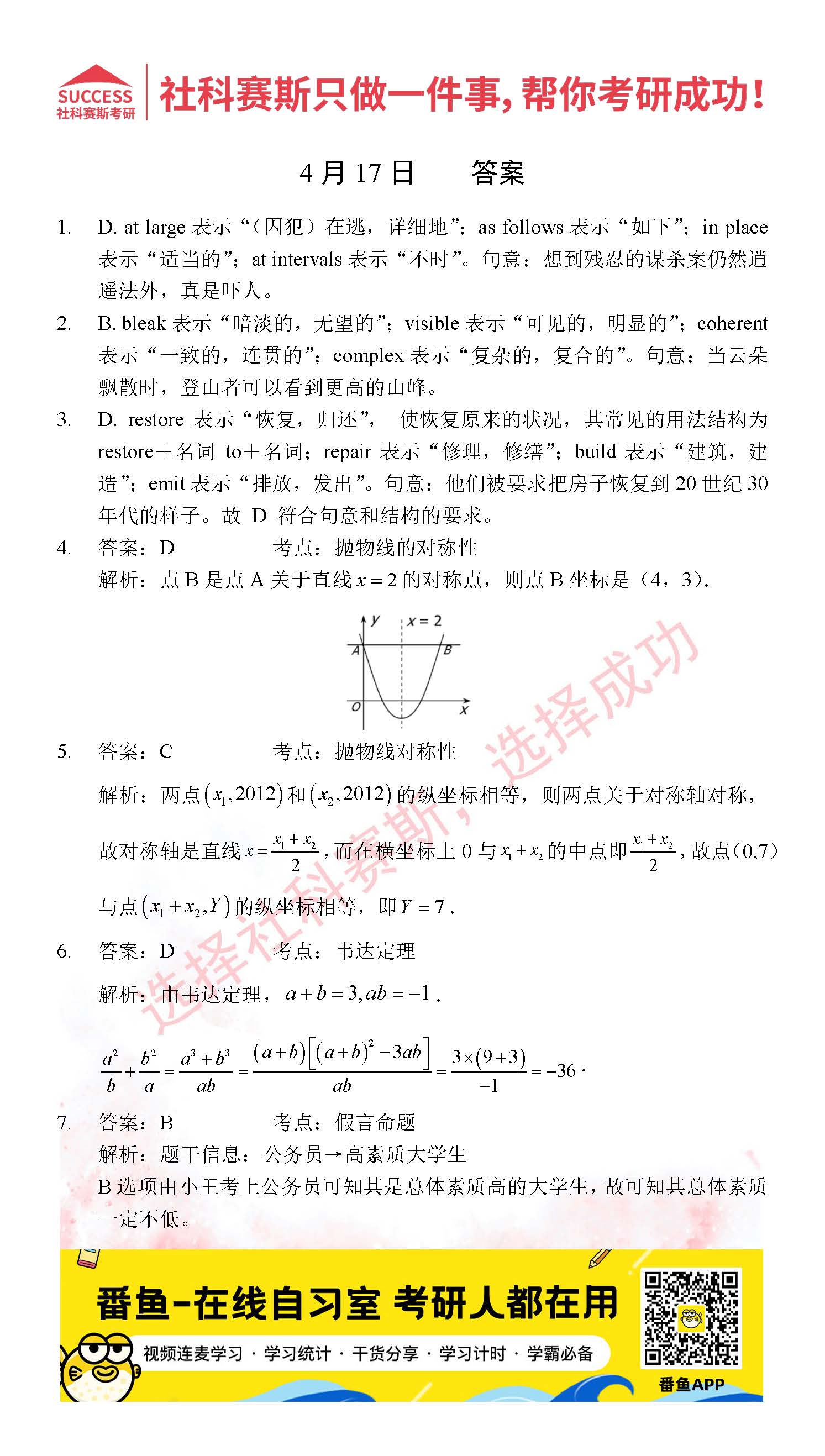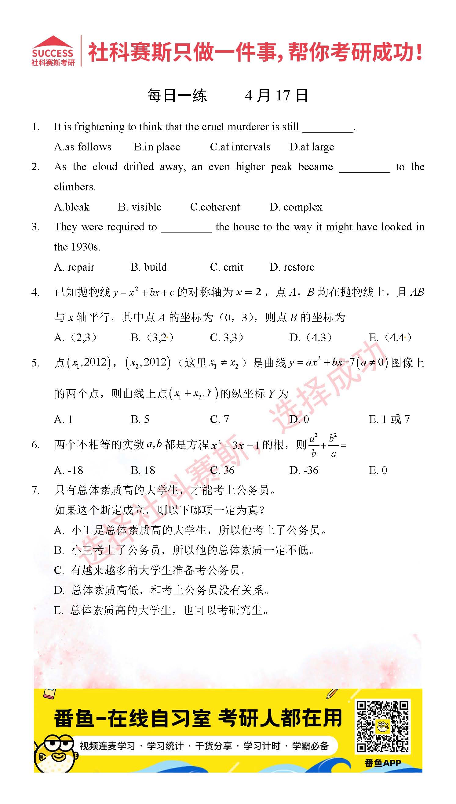 ?以上就是社科賽斯考研網(wǎng)小編為大家整理2022考研每日一練:4月17日管理類聯(lián)考每日一練及答案的全部內(nèi)容,希望各位考生堅(jiān)持利用起來,更多每日一練內(nèi)容請(qǐng)持續(xù)關(guān)注社科賽斯考研網(wǎng)。