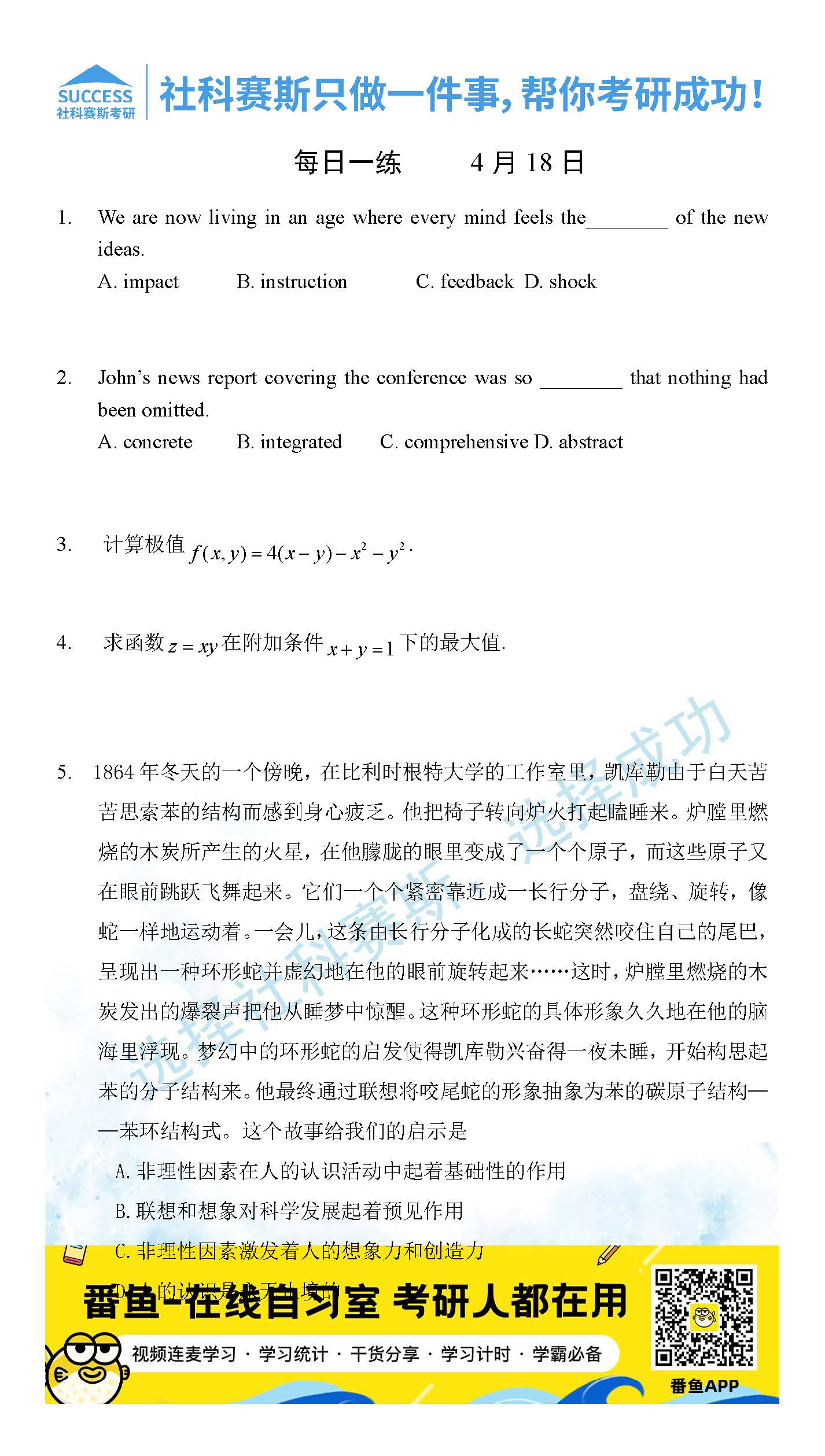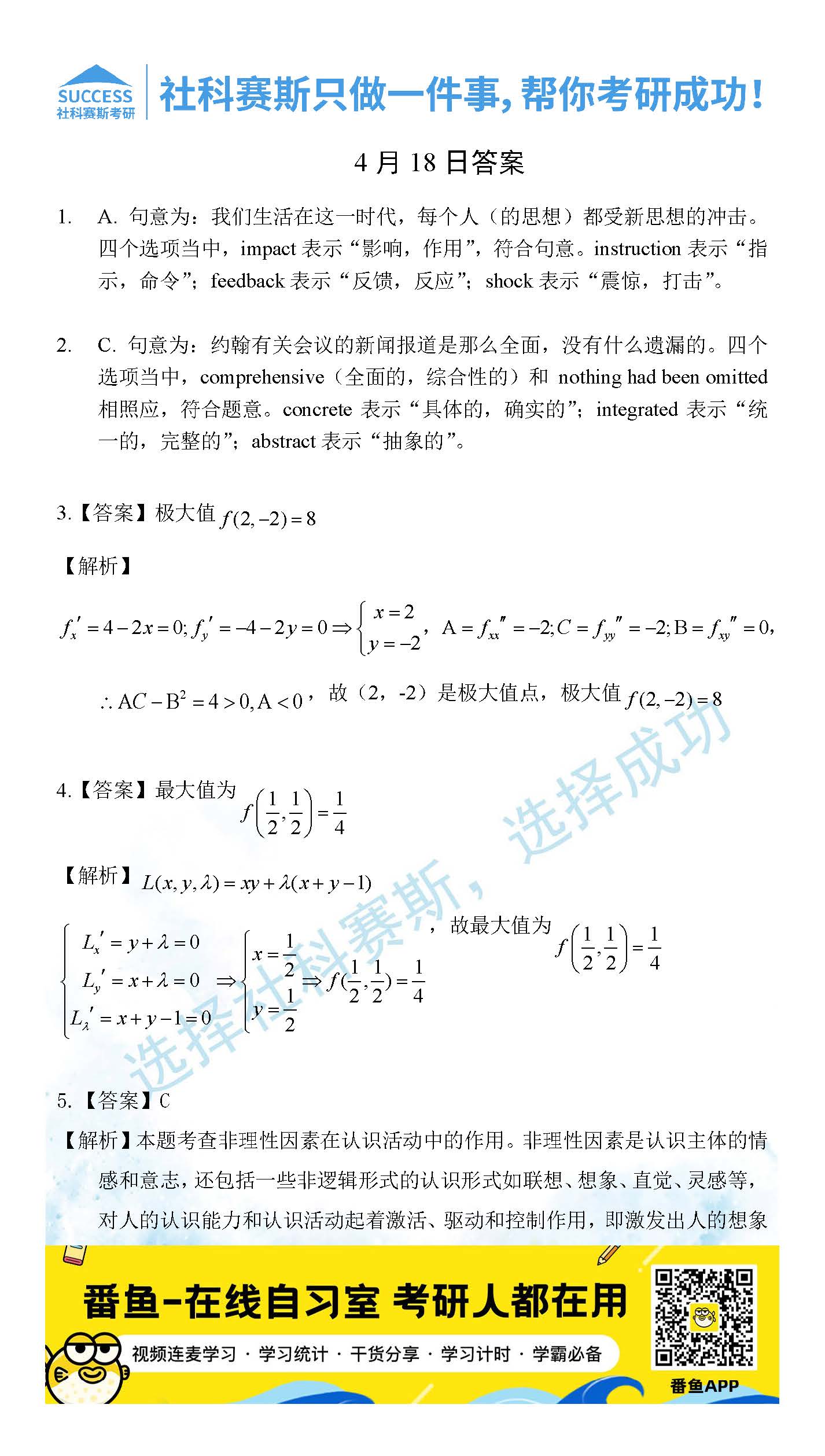考研是一場持久戰(zhàn),保持良好的學(xué)習(xí)習(xí)慣,是能確保復(fù)習(xí)高效的關(guān)鍵。今天社科賽斯考研網(wǎng)小編整理了“2022考研每日一練:4月18管理類聯(lián)考每日一練及答案”的內(nèi)容,希望能對廣大考生有所幫助。