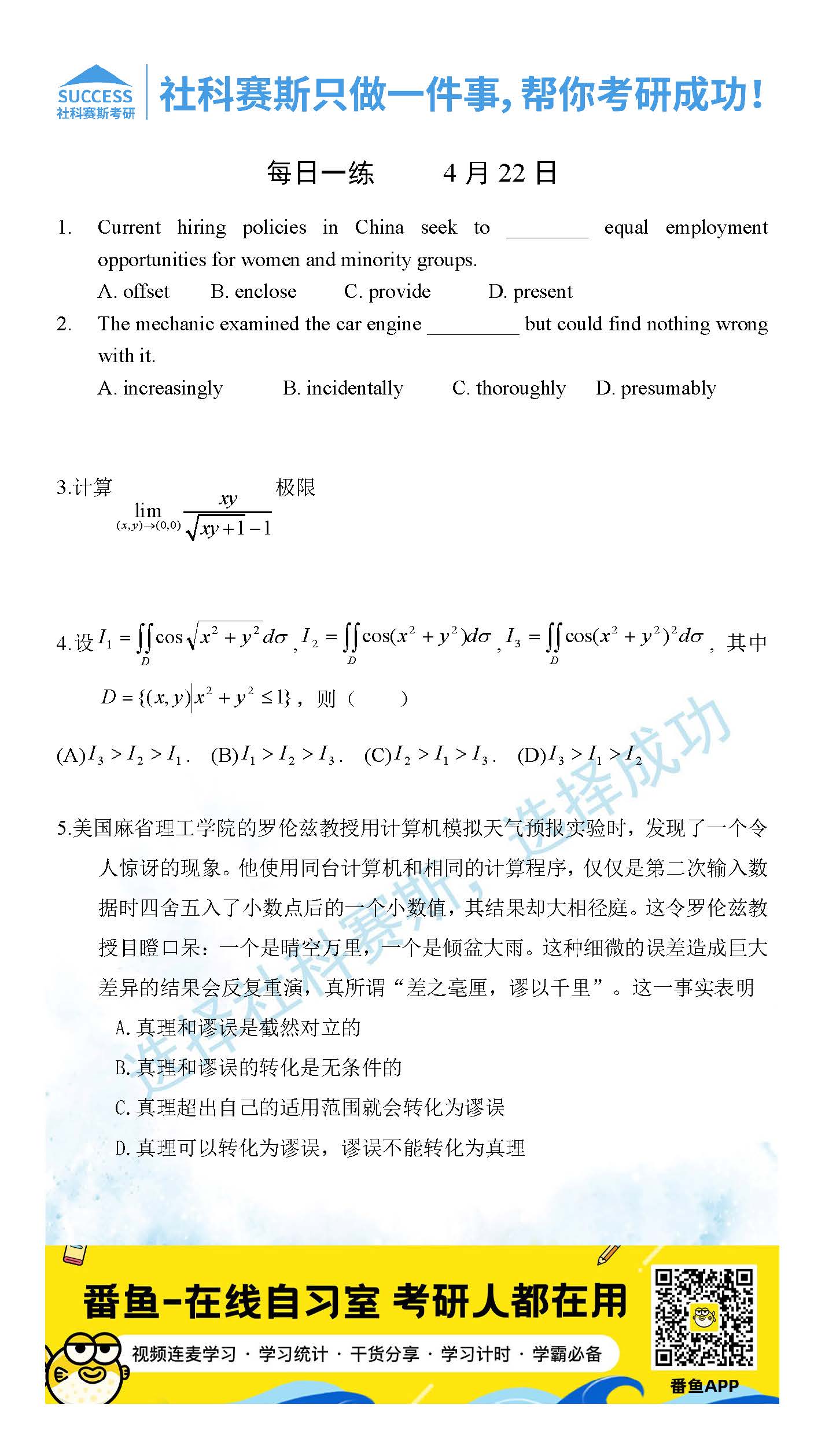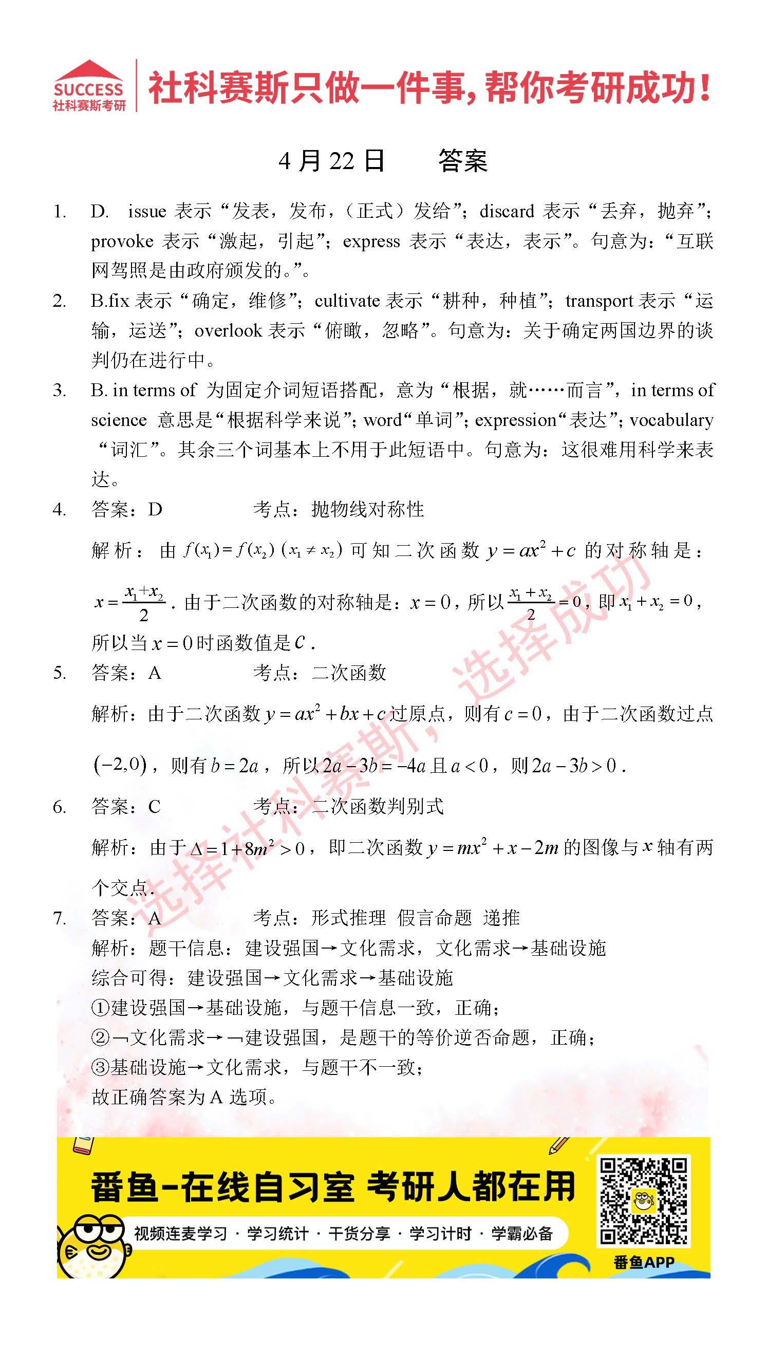 ?以上就是社科賽斯考研網(wǎng)小編為大家整理2022考研每日一練:4月22日管理類聯(lián)考每日一練及答案的全部內(nèi)容,希望各位考生堅持利用起來,更多每日一練內(nèi)容請持續(xù)關(guān)注社科賽斯考研網(wǎng)。