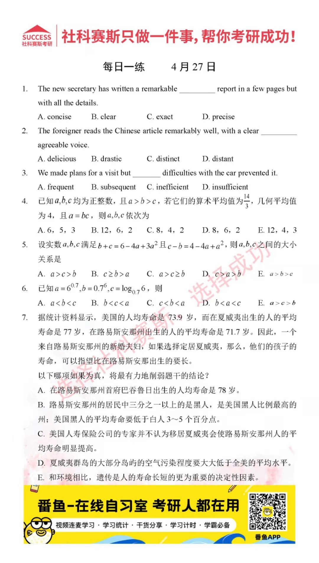 以上就是社科賽斯考研網(wǎng)小編為大家整理2022考研每日一練:4月27日管理類聯(lián)考每日一練及答案的全部內(nèi)容,希望各位考生堅持利用起來,更多每日一練內(nèi)容請持續(xù)關(guān)注社科賽斯考研網(wǎng)。