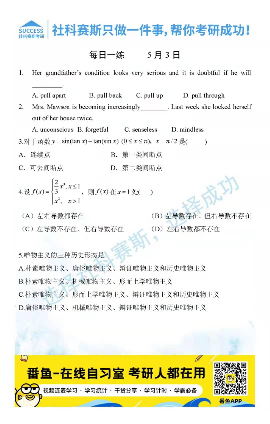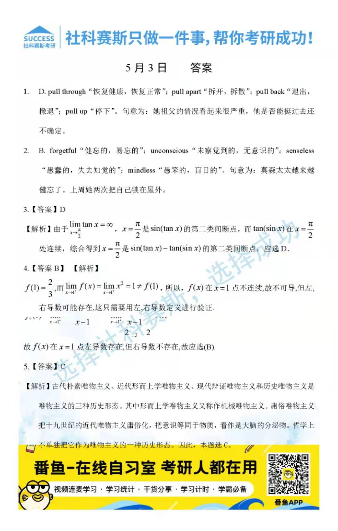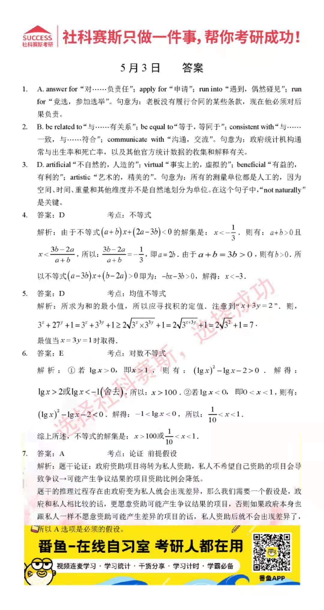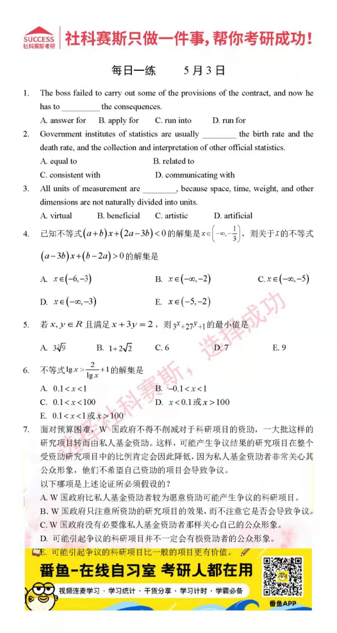 以上就是社科賽斯考研網(wǎng)小編為大家整理2022考研每日一練:5月3日管理類聯(lián)考每日一練及答案的全部?jī)?nèi)容,希望各位考生堅(jiān)持利用起來(lái),更多每日一練內(nèi)容請(qǐng)持續(xù)關(guān)注社科賽斯考研網(wǎng)。
