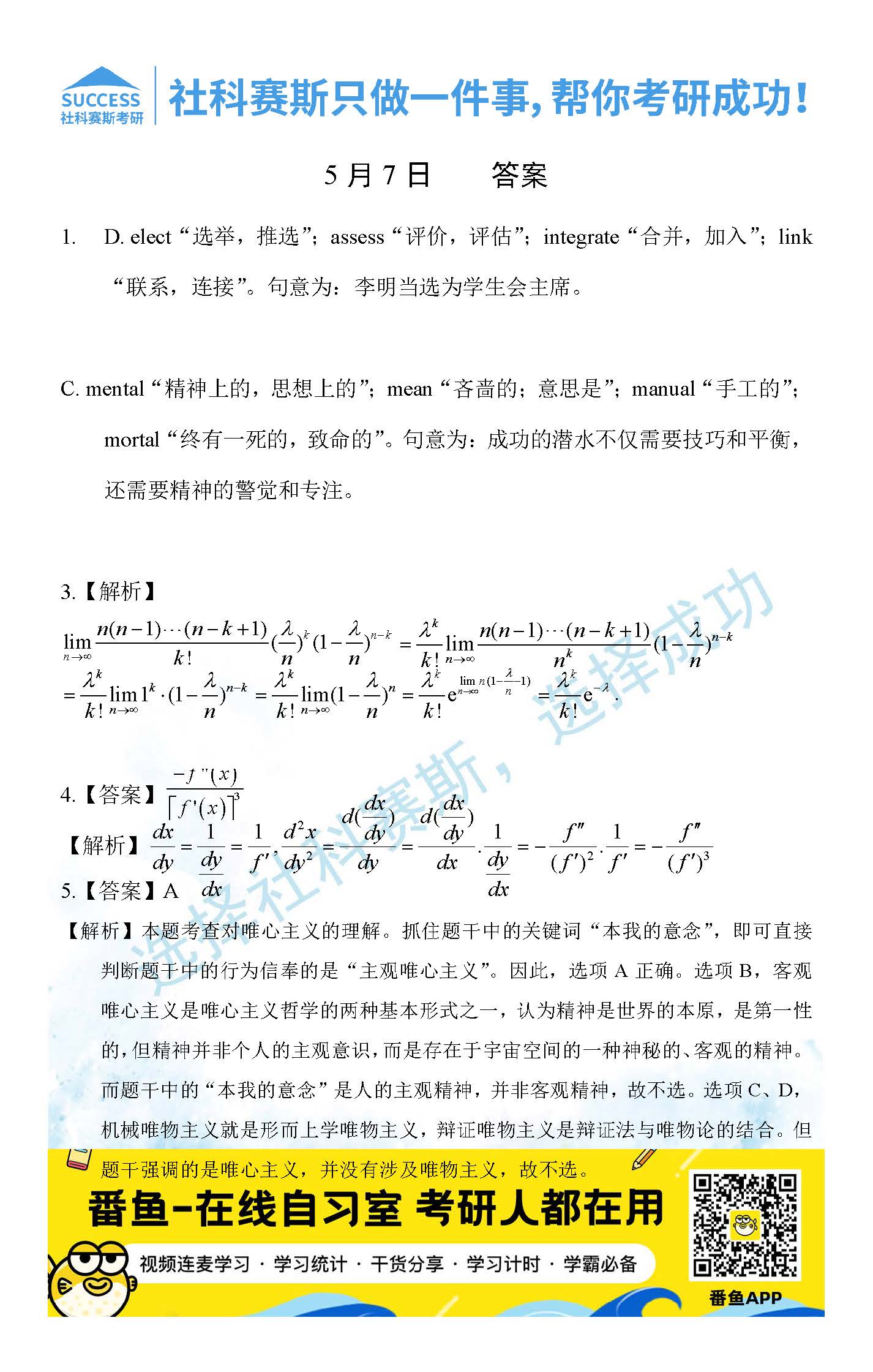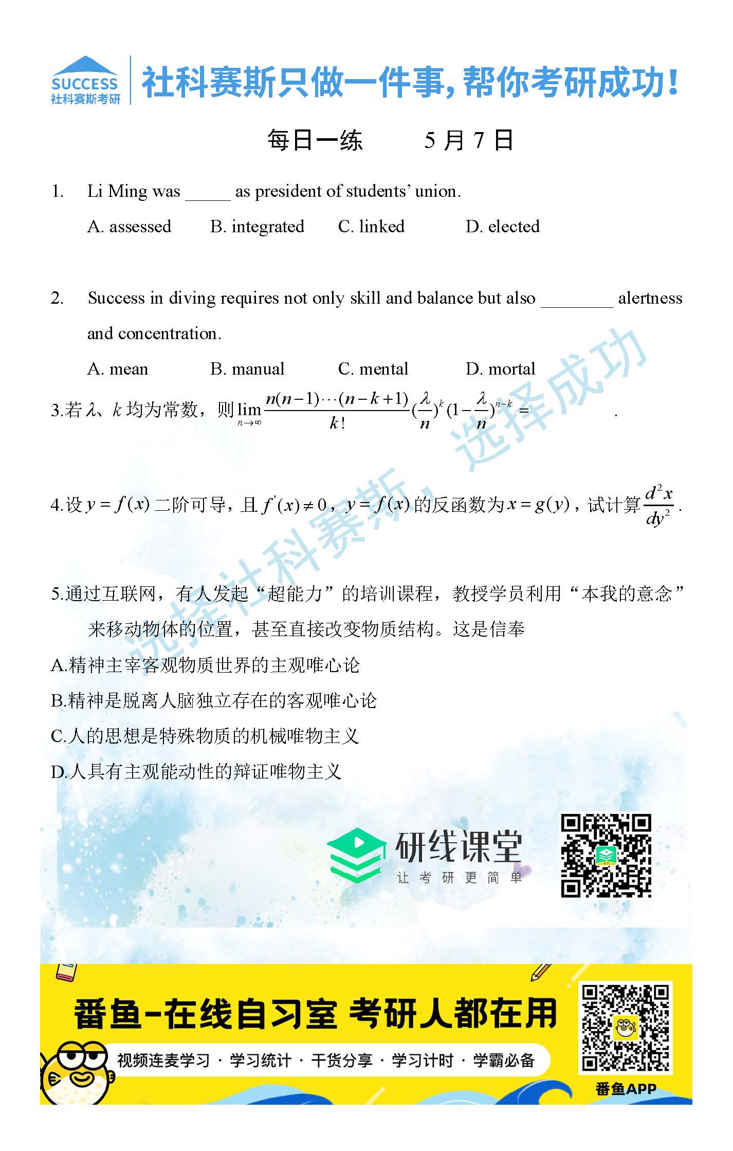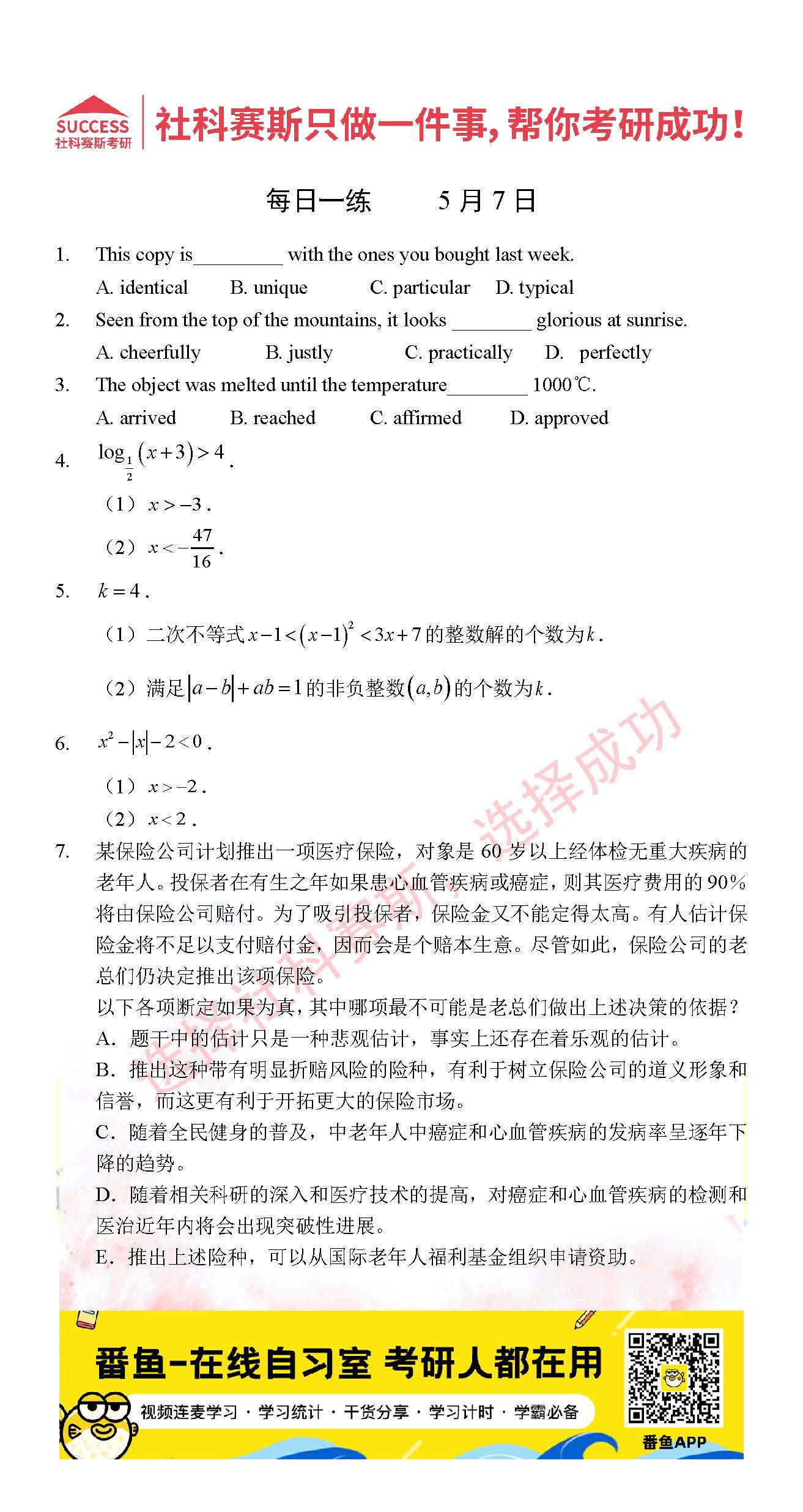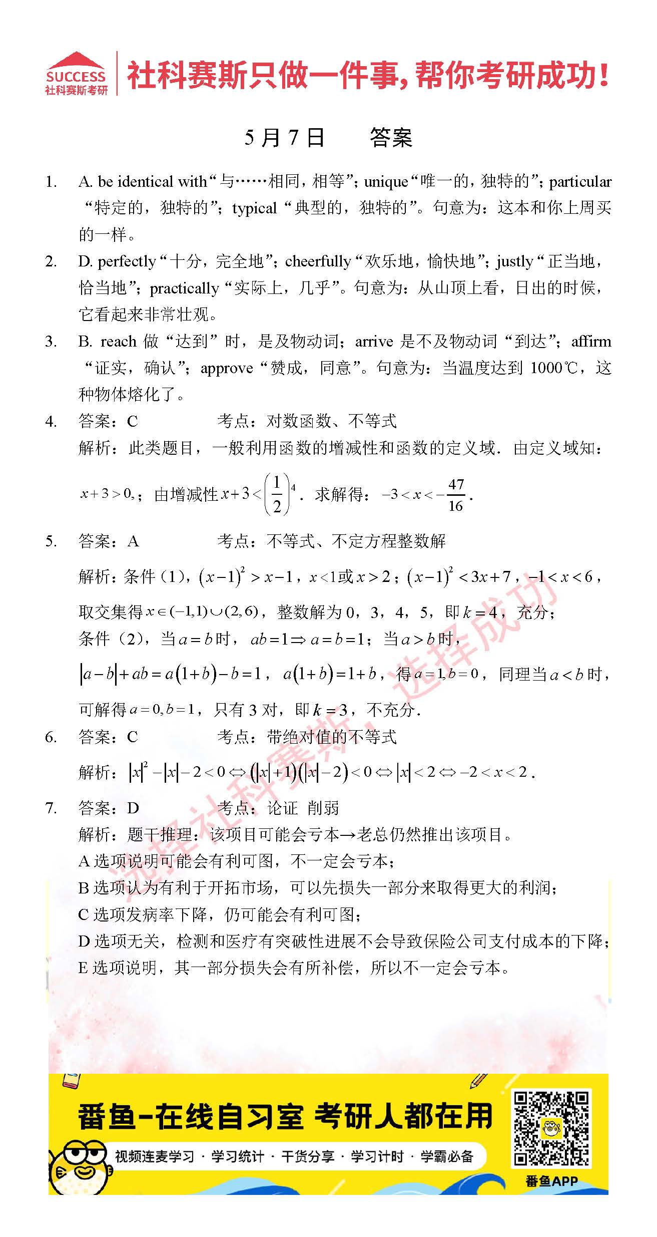 考研是一場(chǎng)持久戰(zhàn),保持良好的學(xué)習(xí)習(xí)慣,是能確保復(fù)習(xí)高效的關(guān)鍵。今天社科賽斯考研網(wǎng)小編整理了“2022考研每日一練:5月7管理類(lèi)聯(lián)考每日一練及答案”的內(nèi)容,希望能對(duì)廣大考生有所幫助。